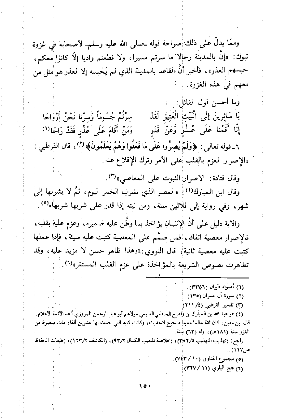 6 - قوله تعالى: {وَلَمْ يُصِرُّوا عَلَى ما فَعَلُوا وَهُمْ يَعْلَمُون} (¬2)، قال القرطبي: "الإِصرار العزم بالقلب على الأمر وترك الإِقلاع عنه.