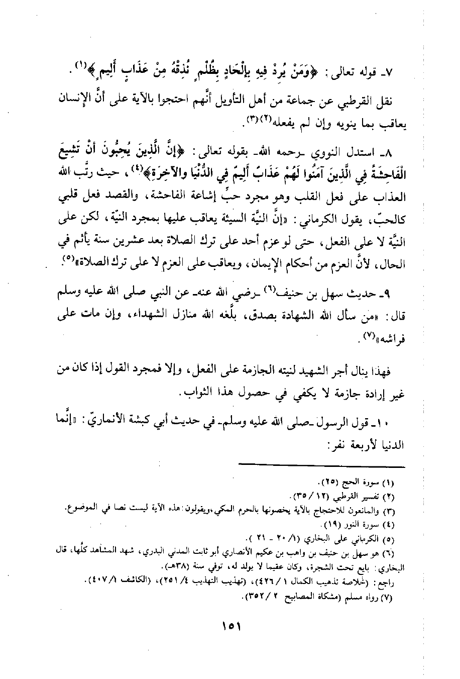8 - استدل النووي -رحمه الله- بقوله تعالى: {إِنَّ الَّذِينَ يُحِبُّونَ أَنْ تَشِيعَ الْفَاحِشَةُ فِي الَّذِينَ آمَنُوا لَهُمْ عَذَابٌ أَلِيمٌ فِي الدُّنْيَا وَالْآخِرَةِ} (¬4)، حيث رتَّب الله العذاب على فعل القلب وهو مجرد حبِّ إشاعة الفاحشة، والقصد فعل قلبي كالحبّ، يقول الكرماني: "إنَّ النية السيئة يعاقب عليها بمجرد النيّة، لكن على النية لا على الفعل، حتى لو عزم أحد على ترك الصلاة بعد عشرين سنة يأثم في الحال، لأن العزم من أحكام الِإيمان، ويعاقب على العزم لا على ترك الصلاة" (¬5).