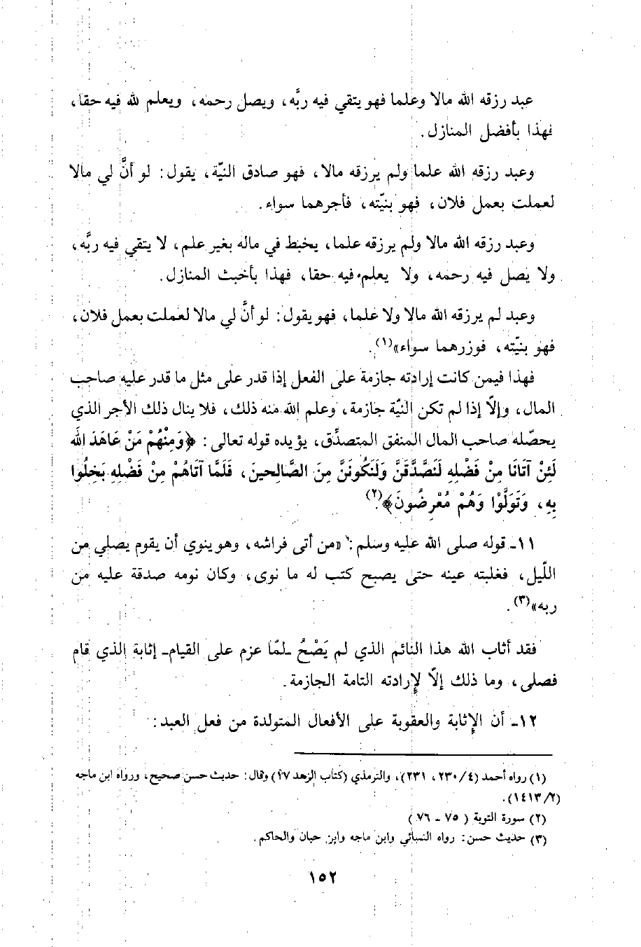 فهذا فمن كانت إرادته جازمة على الفعل إذا قدر على مثل ما قدر عليه صاحب المال، وإلّا إذا لم تكن النيّة جازمة، وعلم الله منه ذلك، فلا ينال ذلك الأجر الذي يحصله صاحب المال المنفق المتصدِّق، يؤيده قوله تعالى: {وَمِنْهُمْ مَنْ عَاهَدَ اللَّهَ لَئِنْ آتَانَا مِنْ فَضْلِهِ لَنَصَّدَّقَنَّ وَلَنَكُونَنَّ مِنَ الصَّالِحِينَ (75) فَلَمَّا آتَاهُمْ مِنْ فَضْلِهِ بَخِلُوا بِهِ وَتَوَلَّوْا وَهُمْ مُعْرِضُونَ} (¬2).