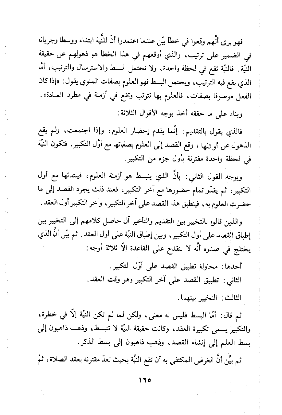 ويوجه القول الثاني: بأن الذي ينبسط هو أزمنة العلوم، فيبتدئها مع أول التكبير، ثم يقدّر تمام حضورها مع آخر التكبير، فعند ذلك يجرد القصد إلى ما حضرت العلوم به، فينطبق هذا القصد على آخر التكبير، وآخر التكبير أول العقد.