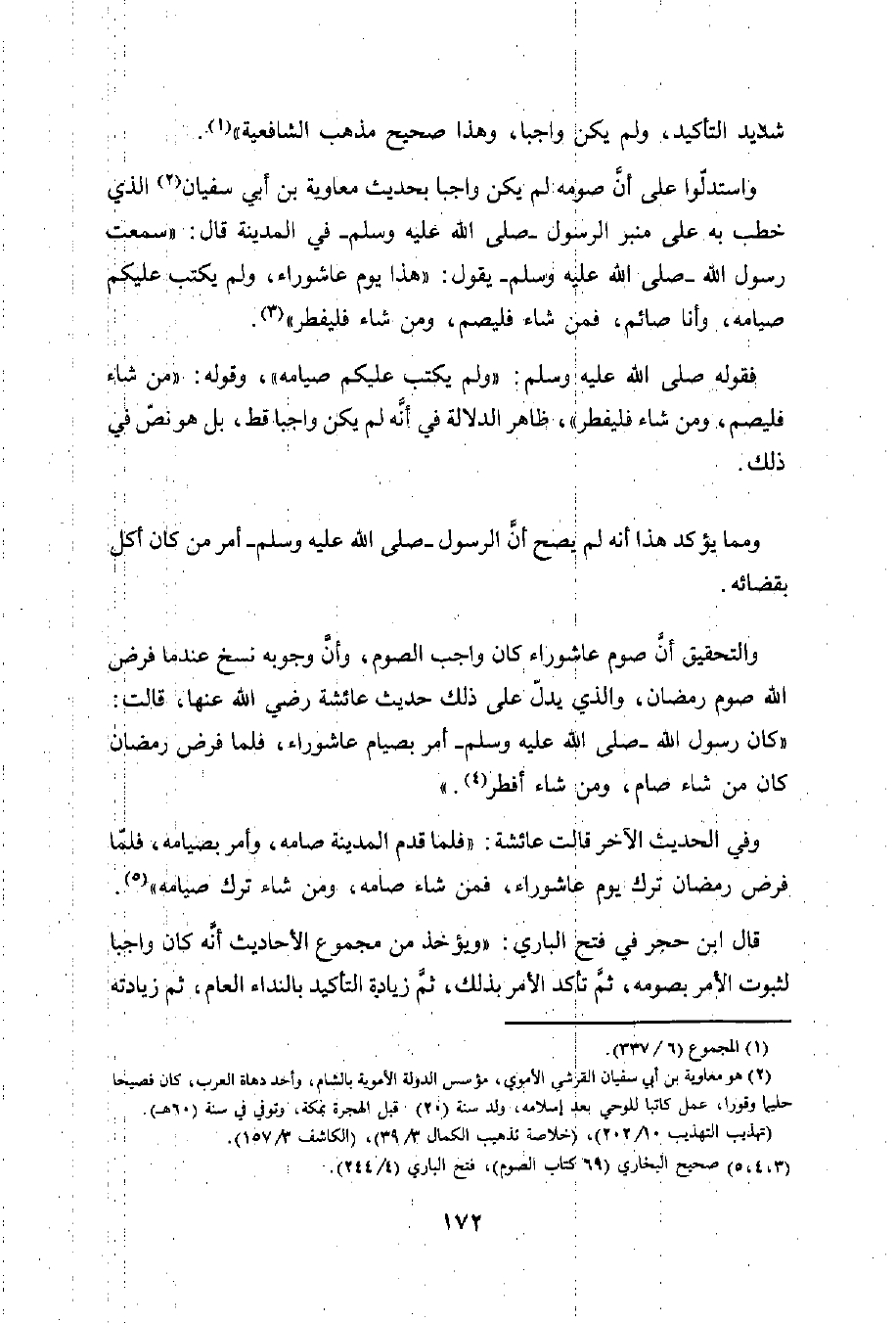 واستدلّوا على أنَّ صومه لم يكن واجبا بحديث معاوية بن أبي سفيان (¬2) الذي خطب به على منبر الرسول -صلى الله عليه وسلم- في المدينة قال: "سمعت رسول الله -صلى الله عليه وسلم- يقول: "هذا يوم عاشوراء، ولم يكتب عليكم صيامه، وأنا صائم، فمن شاء فليصم، ومن شاء فليفطر" (¬3).
