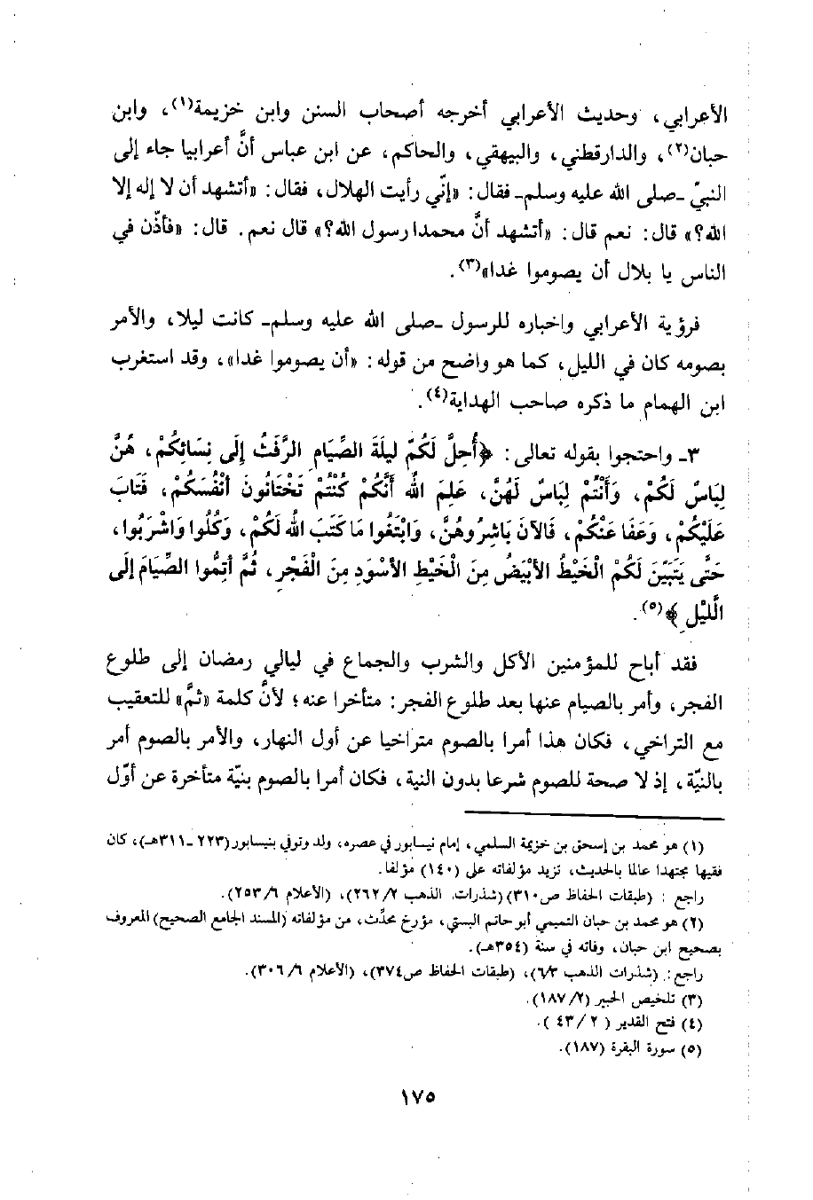 الأعرابي، وحديث الأعرابي أخرجه أصحاب السنن وابن خزيمة (¬1)، وابن حبان (¬2)، والدارقطني، والبيهقي، والحاكم، عن ابن عباس أنَّ أعرابيا جاء إلى النبي -صلى الله عليه وسلم- فقال: "إني رأيت الهلال، فقال: "أتشهد أن لا إله إلا الله؟ " قال: نعم قال: "أتشهد أن محمدا رسول الله؟ " قال نعم. قال:"فأذّن في الناس يا بلال أن يصوموا غدا" (¬3).