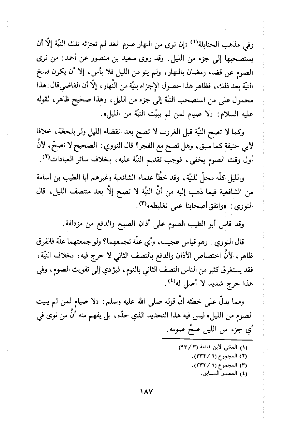قال النووي: وهو قياس عجيب، وأي علّة تجمعهما؟ ولو جمعتهما علّة فالفرق ظاهر، لأن اختصاص الأذان والدفع بالنصف الثاني لا حرج فيه، بخلاف النيّة، فقد يستغرق كثير من الناس النصف الثاني بالنوم، فيؤدي إلى تفويت الصوم، وفي هذا حرج شديد لا أصل له (¬4).