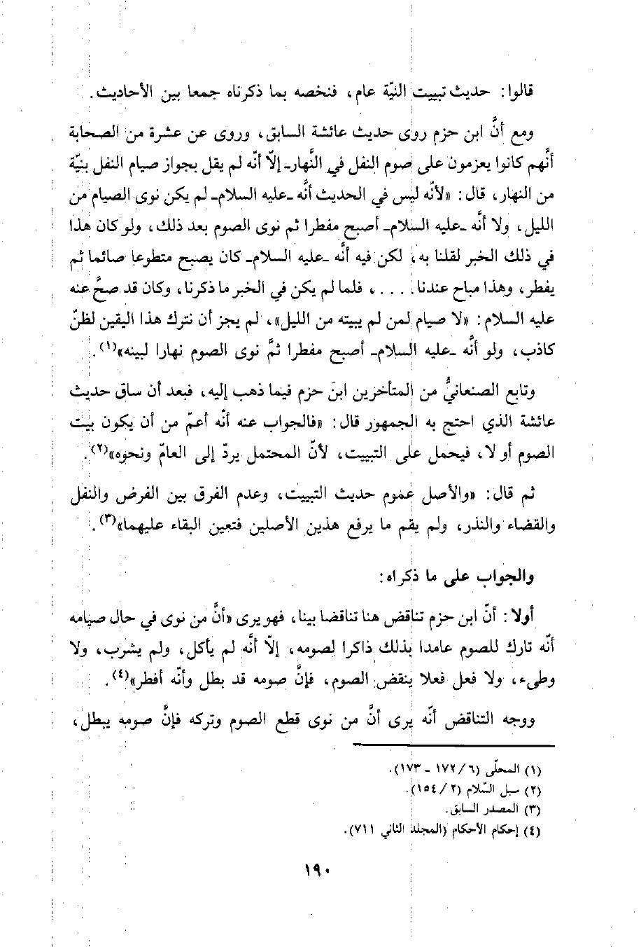 ومع أن ابن حزم روى حديث عائشة السابق، وروى عن عشرة من الصحابة أنهم كانوا يعزمون على صوم النفل في النَّهار -إلاّ أنّه لم يقل بجواز صيام النفل بنية من النهار، قال: "لأنّه ليس في الحديث أنَّه -عليه السلام- لم يكن نوى الصيام من الليل، ولا أنَّه -عليه السلام- أصبح مفطرا ثم نوى الصوم بعد ذلك، ولو كان هذا في ذلك الخبر لقلنا به، لكن فيه أنَّه -عليه السلام- كان يصبح متطوعا صائما ثم يفطر، وهذا مباح عندنا .... ، فلما لم يكن في الخبر ما ذكرنا، وكان قد صحَّ عنه عليه السلام: "لا صيام لمن لم يبيته من الليل "، لم يجز أن نترك هذا اليقين لظن كاذب، ولو أنه -عليه السلام- أصبح مفطرا ثمَّ نوى الصوم نهارا لبينه" (¬1).