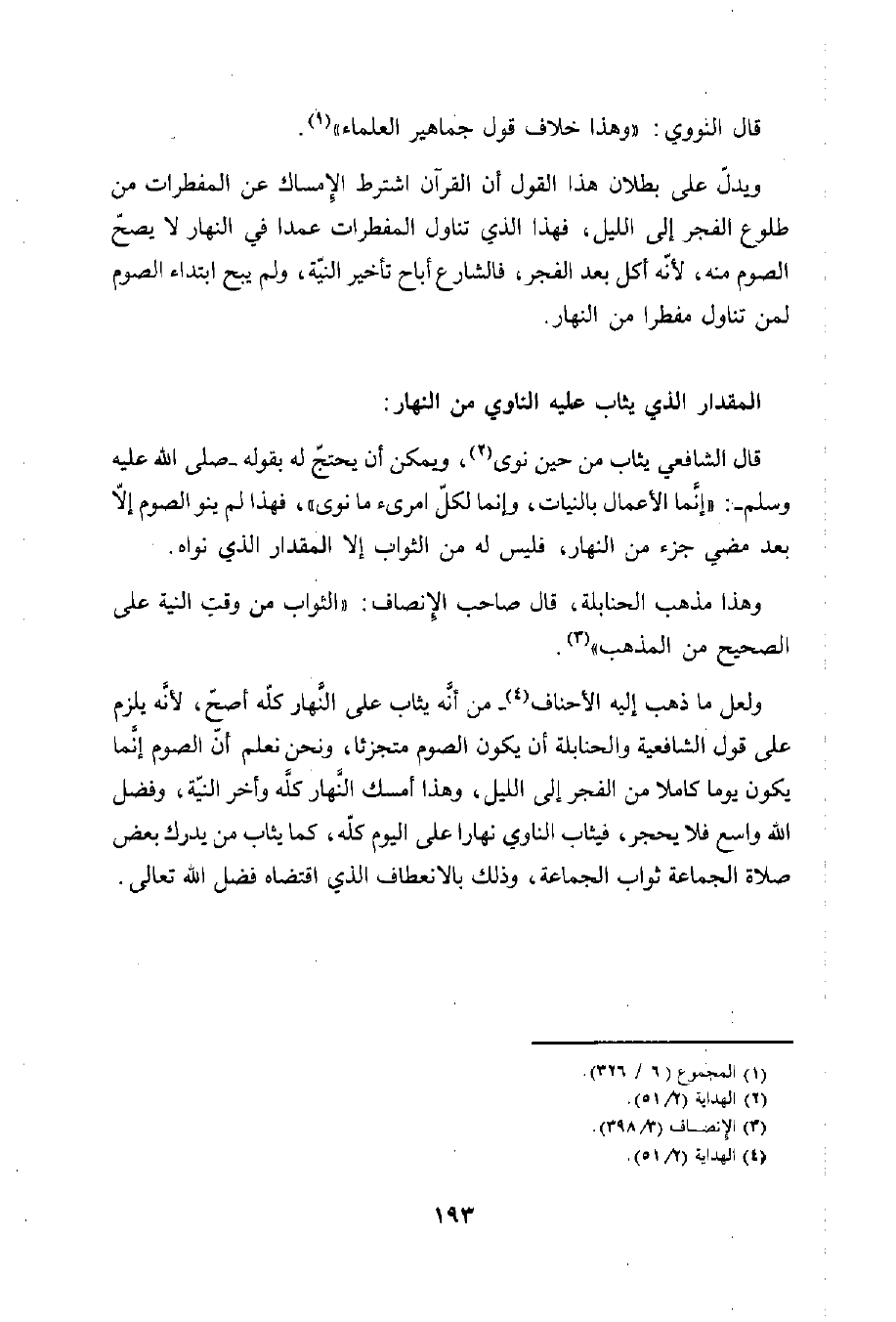 ولعل ما ذهب إليه الأحناف (¬4) - من أنَّه يثاب على النّهار كلّه أصحّ، لأنه يلزم على قول الشافعية والحنابلة أن يكون الصوم متجزئا، ونحن نعلم أنّ الصوم إنما يكون يوما كاملا من الفجر إلى الليل، وهذا أمسك النَّهار كلَّه وأخر النية، وفضل الله واسع فلا يحجر، فيثاب الناوي نهارا على اليوم كلّه، كما يثاب من يدرك بعض صلاة الجماعة ثواب الجماعة، وذلك بالانعطاف الذي اقتضاه فضل الله تعالى.
