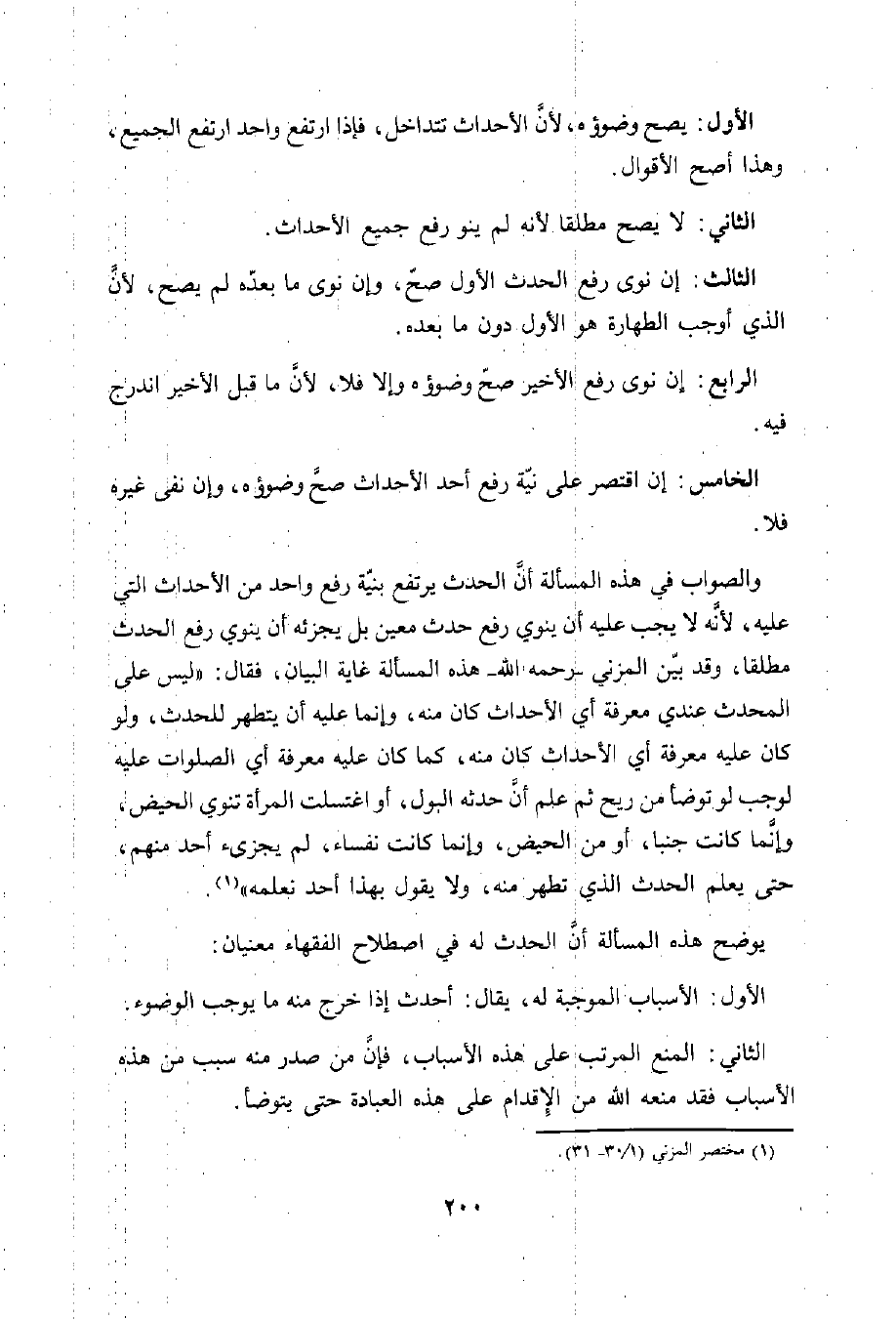 والصواب في هذه المسألة أن الحدث يرتفع بنيّة رفع واحد من الأحداث التي عليه، لأنه لا يجب عليه أن ينوي رفع حدث معين بل يجزئه أن ينوي رفع الحدث مطلقا، وقد بين المزني -رحمه الله- هذه المسألة غاية البيان، فقال: "ليس على المحدث عندي معرفة أي الأحداث كان منه، وإنما عليه أن يتطهر للحديث، ولو كان عليه معرفة أي الأحداث كان منه، كما كان عليه معرفة أي الصلوات عليه لوجب لو توضأ من ريح ثم علم أنَّ حدثه البول، أو اغتسلت المرأة تنوي الحيض، وإنما كانت جنبا، أو من الحيض، وإنما كانت نفساء، لم يجزىء أحد منهم، حتى يعلم الحدث الذي تطهر منه، ولا يقول بهذا أحد نعلمه" (¬1).