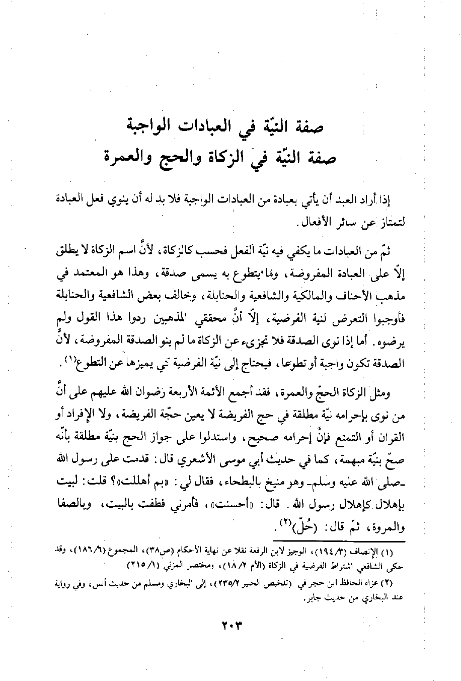 ومثل الزكاة الحجّ والعمرة، فقد أجمع الأئمة الأربعة رضوان الله عليهم على أن من نوى بإحرامه نيّة مطلقة في حج الفريضة لا يعين حجة الفريضة، ولا الإفراد أو القران أو التمتع فإن إحرامه صحيح، واستدلوا على جواز الحج بنية مطلقة بأنّه صح بنيّة مبهمة، كما في حديث أبي موسى الأشعري قال: قدمت على رسول الله -صلى الله عليه وسلم- وهو منيخ بالبطحاء، فقال لي: "بم أهللت"؟ قلت: لبيت بإهلال كإهلال رسول الله. قال: "أحسنت"، فأمرني فطفت بالبيت، وبالصفا والمروة، ثم قال: (حُلّ) (¬2).