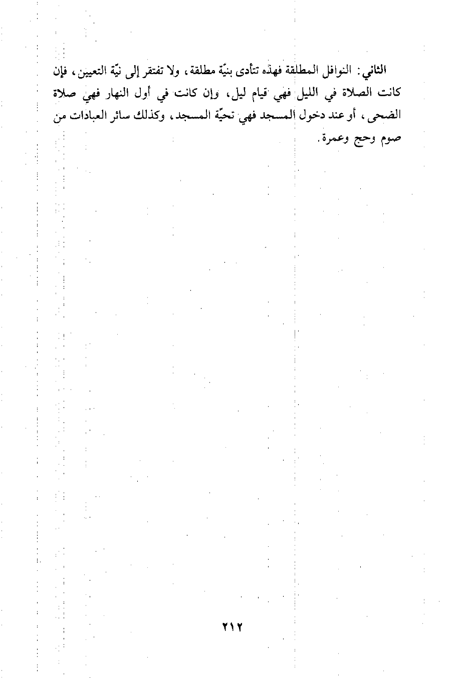 الثاني: النوافل المطلقة فهذه تتأدى بنيّة مطلقة، ولا تفتقر إلى نيّة التعيين، فإن كانت الصلاة في الليل فهي قيام ليل، وإن كانت في أول النهار فهي صلاة الضحى، أو عند دخول المسجد فهي تحيّة المسجد، وكذلك سائر العبادات من صوم وحج وعمرة.