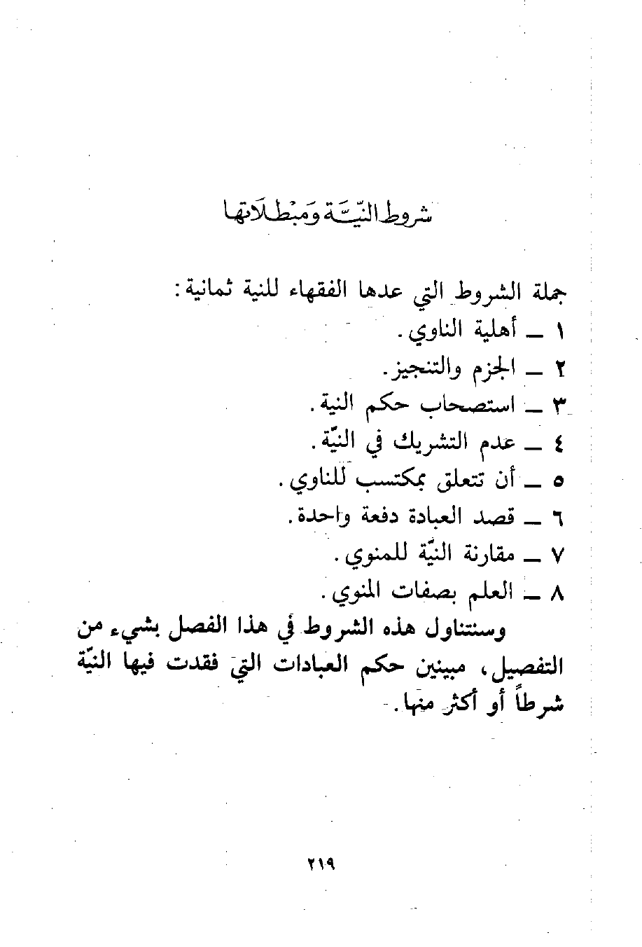 وسنتناول هذه الشروط في هذا الفصل بشيء من التفصيل، مبينين حكم العبادات التي فقدت فيها النيّة شرطًا أو أكثر منها.