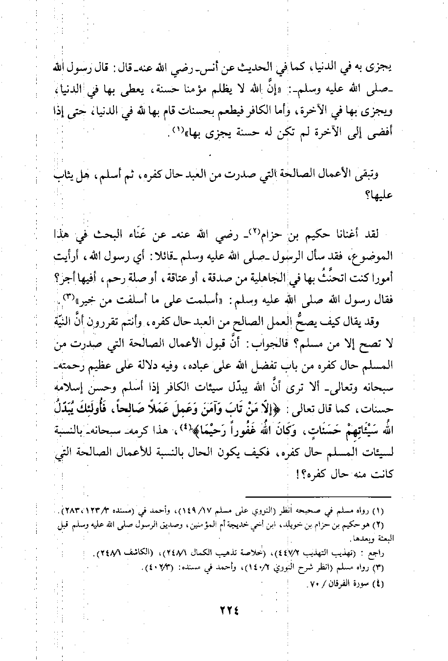 وقد يقال كيف يصحُّ العمل الصالح من العبد حال كفره، وأنتم تقررون أنَّ النية لا تصح إلا من مسلم؟ فالجواب: أنَّ قبول الأعمال الصالحة التي صدرت من المسلم حال كفره من باب تفضل الله على عباده، وفيه دلالة على عظيم رحمته -سبحانه وتعالى- ألا ترى أنَّ الله يبدّل سيئات الكافر إذا أسلم وحسن إسلامه حسنات، كما قال تعالى: {إِلَّا مَنْ تَابَ وَآمَنَ وَعَمِلَ عَمَلًا صَالِحًا فَأُولَئِكَ يُبَدِّلُ اللَّهُ سَيِّئَاتِهِمْ حَسَنَاتٍ وَكَانَ اللَّهُ غَفُورًا رَحِيمًا} (¬4)، هذا كرمه -سبحانه- بالنسبة لسيئات المسلم حال كفره، فكيف يكون الحال بالنسبة للأعمال الصالحة التي كانت منه حال كفره؟!