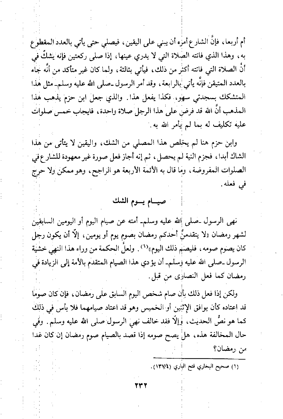 وابن حزم هنا لم يخلص هذا المصلي من الشك، واليقين لا يتأتى من هذا الشاك أبدا، فجزم النية لم يحصل، ثم إنه أجاز فعل صورة غير معهودة الشارع في الصلوات المفروضة، وما قال به الأئمة الأربعة هو الراجح، وهو ممكن ولا حرج في فعله.