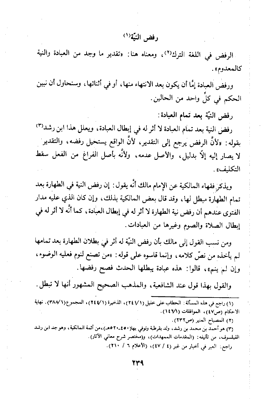رفض النية بعد تمام العادة لا أثر له في إبطال العبادة، ويعلل هذا ابن رشد (¬3) بقوله: "لأن الرفض يرجع إلى التقدير، لأنَّ الواقع يستحيل رفضه، والتقدير لا يصار إليه إلاّ بدليل، والأصل عدمه، ولأنه بأصل الفراغ من الفعل سقط التكليف".