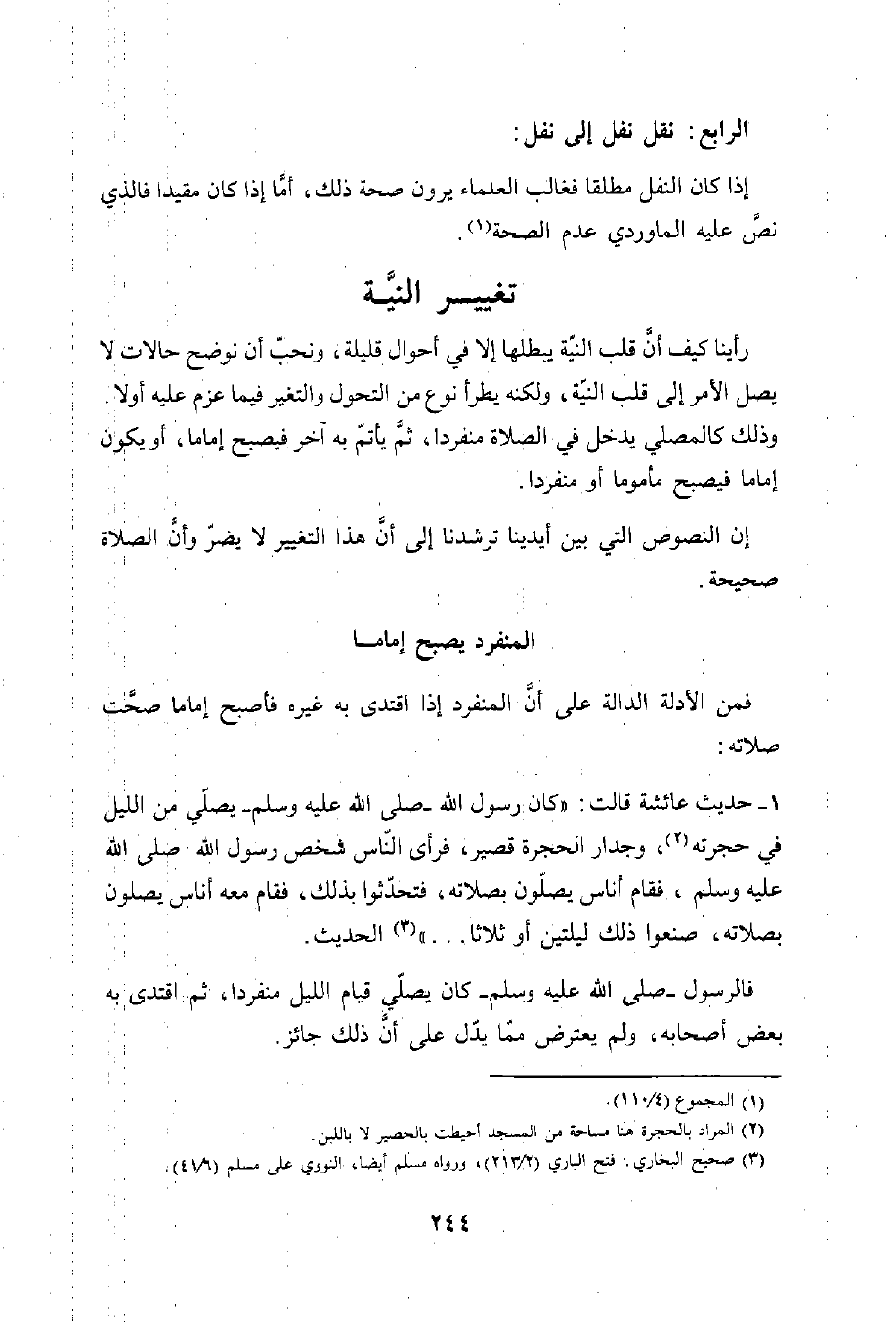 وذلك كالمصلي يدخل في الصلاة منفردا، ثم يأتم به آخر فيصبح إماما، أو يكون إماما فيصبح مأموما أو منفردا.