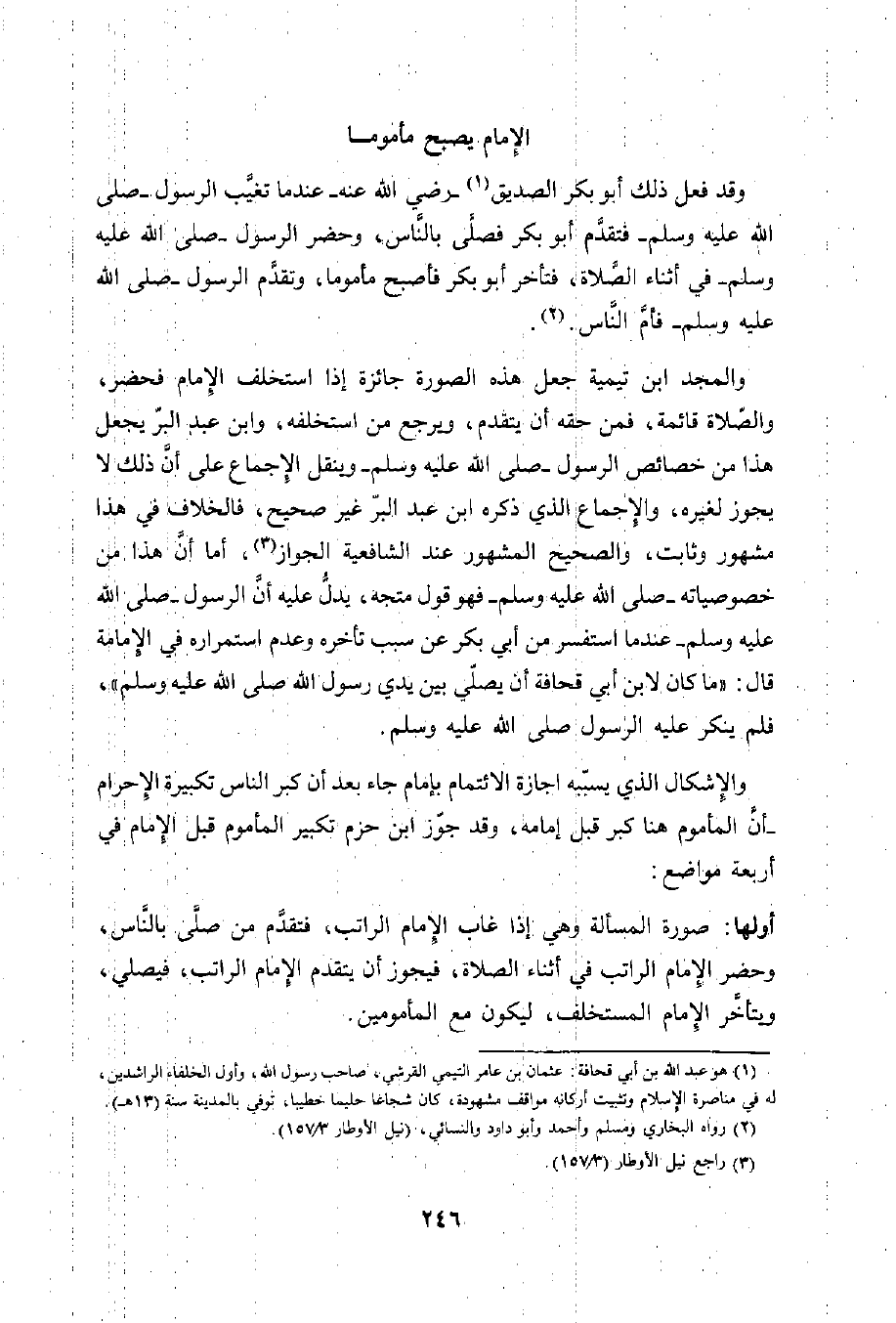 والمجد ابن تيمية جعل هذه الصورة جائزة إذا استخلف الِإمام فحضر، والصّلاة قائمة، فمن حقه أن يتقدم، ويرجع من استخلفه، وابن عبد البرّ يجعل هذا من خصائص الرسول -صلى الله عليه وسلم- وينقل الِإجماع على أن ذلك لا يجوز لغيره، والإجماع الذي ذكره ابن عبد البرّ غير صحيح، فالخلاف في هذا مشهور وثابت، والصحيح المشهور عند الشافعية الجواز (¬3)، أما أنَّ هذا من خصوصياته -صلى الله عليه وسلم- فهو قول متجه، يدلُّ عليه أن الرسول -صلى الله عليه وسلم- عندما استفسر من أبي بكر عن سبب تأخره وعدم استمراره في الإمامة قال: "ما كان لابن أبي قحافة أن يصلّي بين يدي رسول الله صلى الله عليه وسلم"، فلم ينكر عليه الرسول صلى الله عليه وسلم.