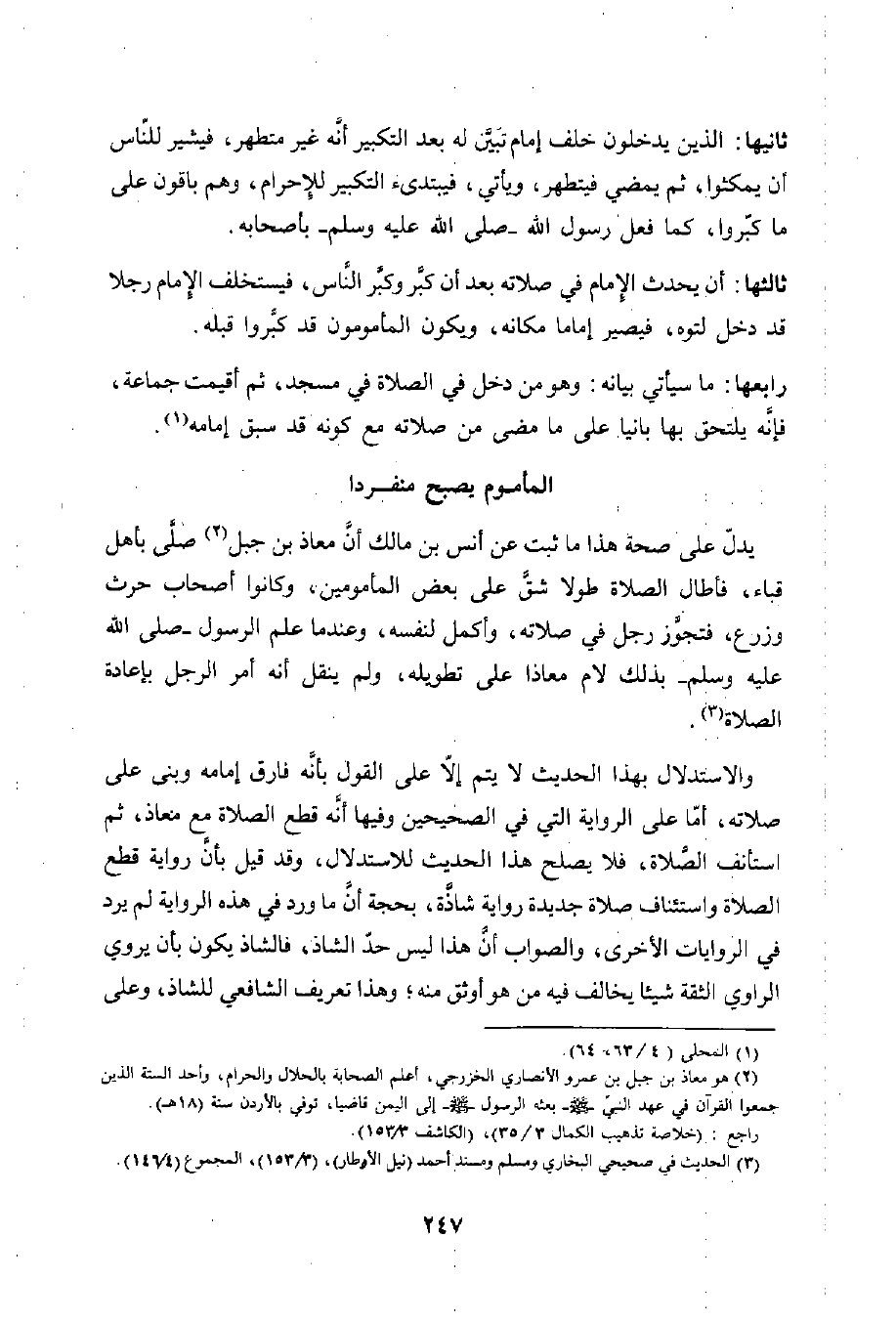 يدلّ على صحة هذا ما ثبت عن أنس بن مالك أنَّ معاذ بن جبل (¬2) صلى بأهل قباء، فأطال الصلاة طولا شقَّ على بعض المأمومين، وكانوا أصحاب حرث وزرع، تجوَّز رجل في صلاته، وأكمل لنفسه، وعندما علم الرسول -صلى الله عليه ومسلم- بذلك لام معاذا على تطويله، ولم ينقل أنه أمر الرجل بإعادة الصلاة (¬3).