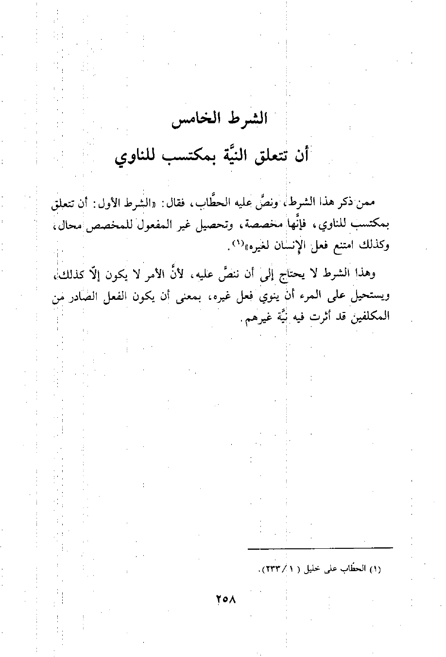 ممن ذكر هذا الشرط، ونصَّ عليه الحطَّاب، فقال: "الشرط الأول: أن تتعلق بمكتسب للناوي، فإنَّها مخصصة، وتحصيل غير المفعول للمخصص محال، وكذلك امتنع فعل الإنسان لغيره" (¬1).