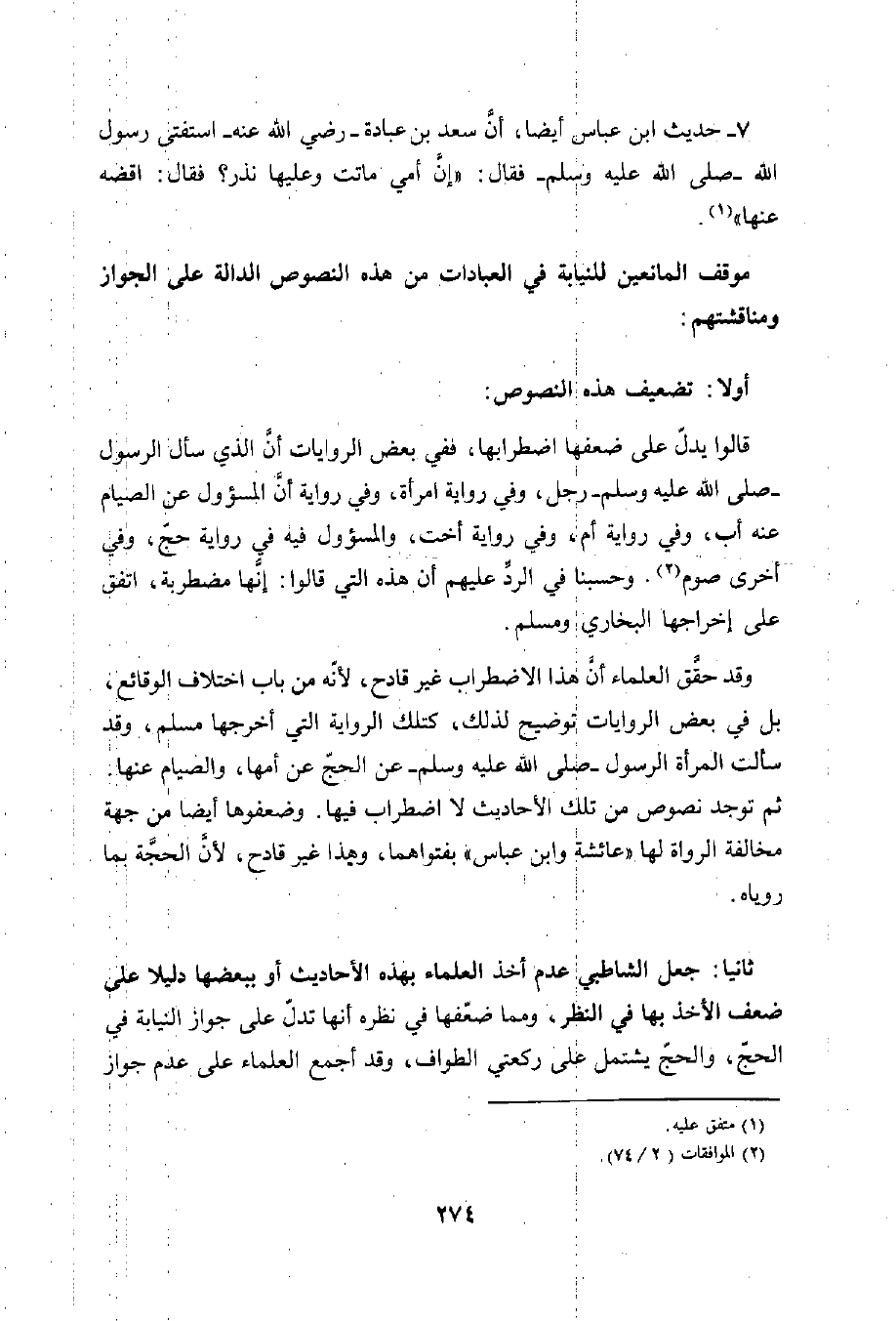 ثانيا: جعل الشاطبي عدم أخذ العلماء بهذه الأحاديث أو ببعضها دليلا على ضعف الأخذ بها في النظر، ومما ضعّفها في نظره، أنها تدلّ على جواز النيابة في الحجّ، والحجّ يشتمل على ركعتي الطواف، وقد أجمع العلماء على عدم جواز