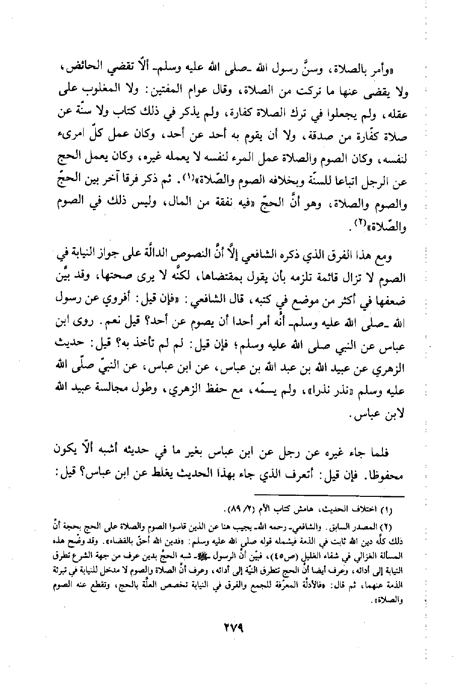 "وأمر بالصلاة، وسنَّ رسول الله -صلى الله عليه وسلم- ألا تقضي الحائض، ولا يقضى عنها ما تركت من الصلاة، وقال عوام المفتين: ولا المغلوب على عقله، ولم يجعلوا في ترك الصلاة كفارة، ولم يذكر في ذلك كتاب ولا سنّة عن صلاة كفّارة من صدقة، ولا أن يقوم به أحد عن أحد، وكان عمل كلّ امرىء لنفسه، وكان الصوم والصلاة عمل المرء لنفسه لا يعمله غيره، وكان يعمل الحج عن الرجل اتباعا للسنّة وبخلافه الصوم والصّلاة" (¬1). ثم ذكر فرقا آخر بين الحجّ والصوم والصلاة، وهو أنَّ الحجّ "فيه نفقة من المال، وليس ذلك في الصوم والصلاة" (¬2).