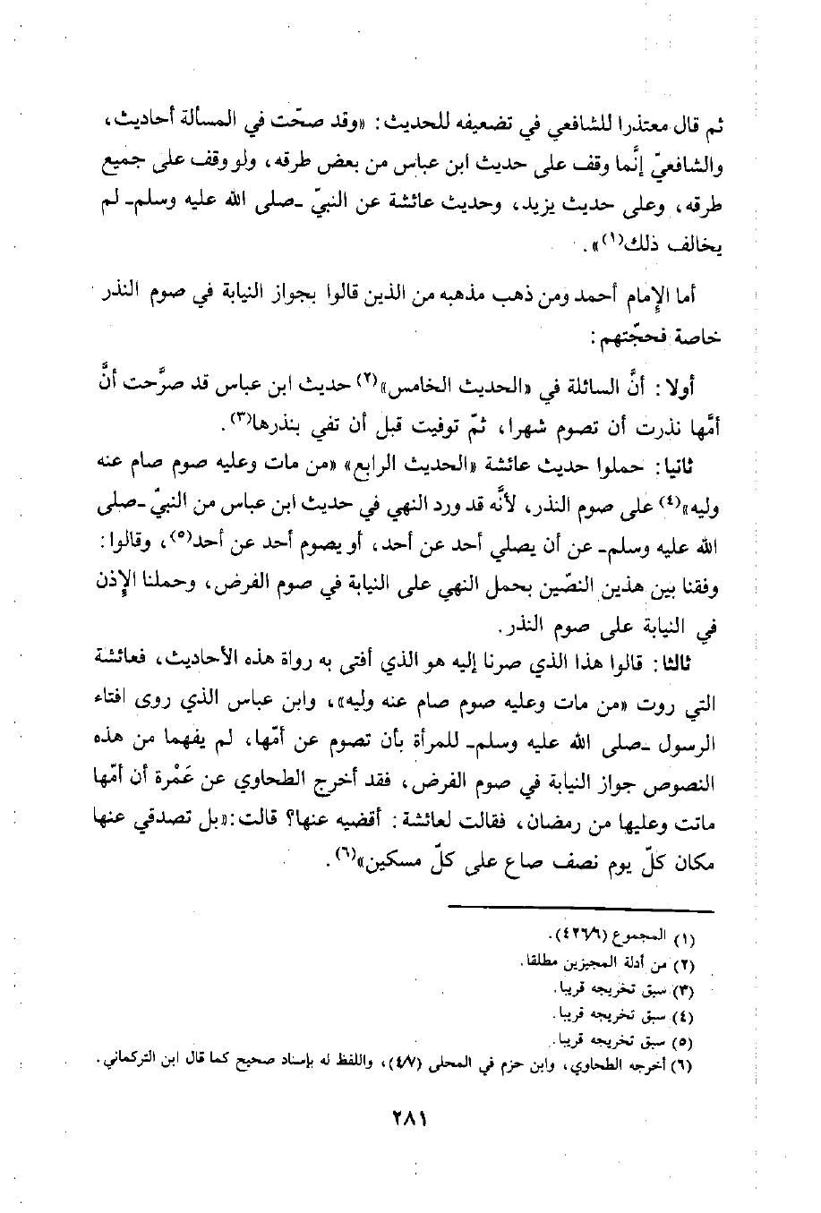ثالثا: قالوا هذا الذي صرنا إليه هو الذى أفتى به رواة هذه الأحاديث، فعائشة التي روت "من مات وعليه صوم صام عنه وليه"، وابن عباس الذي روى افتاء الرسول -صلى الله عليه وسلم- للمرأة بأن تصوم عن أمّها، لم يفهما من هذه النصوص جواز النيابة في صوم الفرض، فقد أخرج الطحاوي عن عَمْرة أن أمّها ماتت وعليها من رمضان، فقالت لعائشة: أقضيه عنها؟ قالت: "بل تصدقي عنها مكان كلّ يوم نصف صاع على كل مسكين" (¬6).