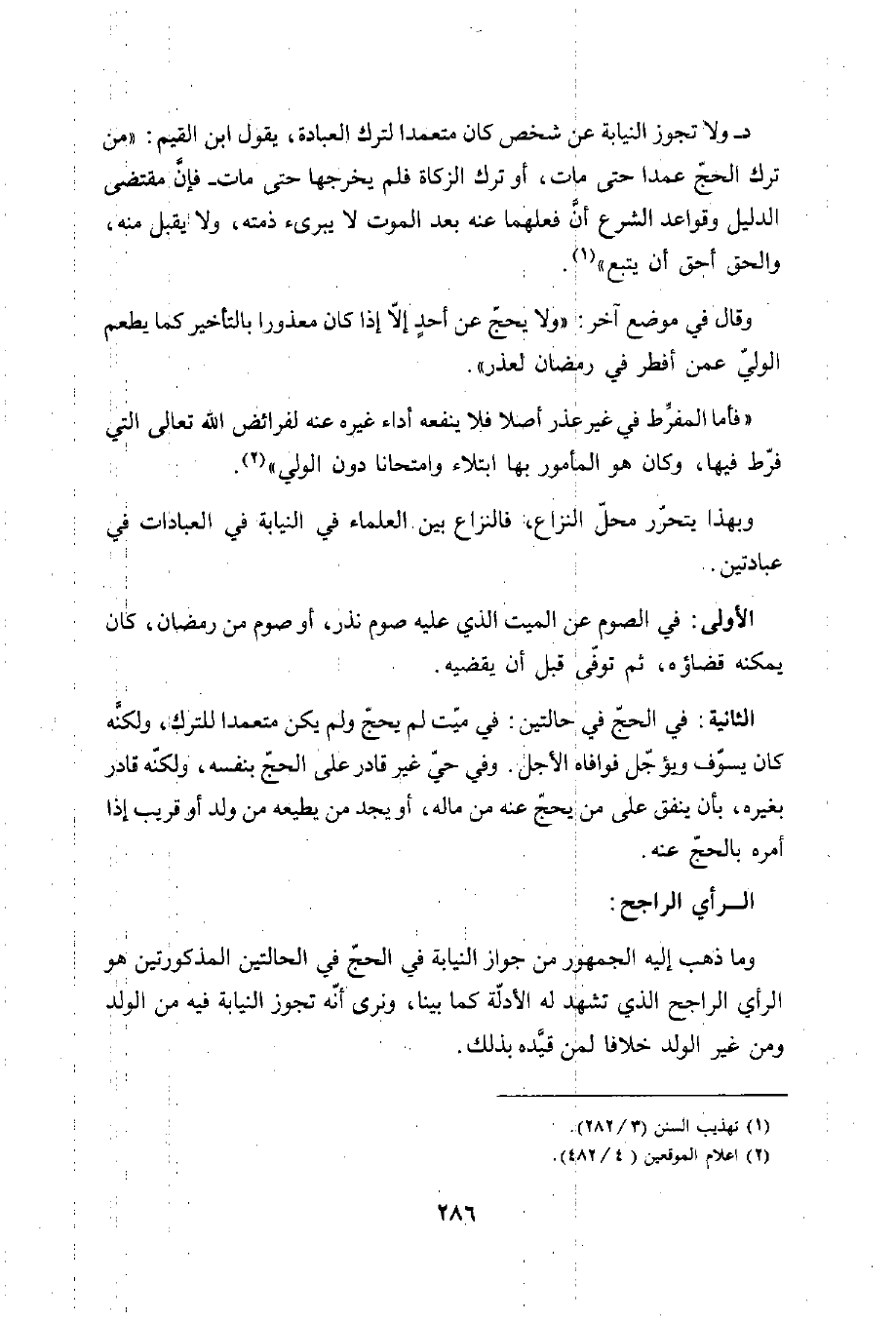 د- ولا تجوز النيابة عن شخص كان متعمدا لترك العبادة، يقول ابن القيم: "من ترك الحجّ عمدا حتى مات، أو ترك الزكاة فلم يخرجها حتى مات- فإن مقتضى الدليل وقواعد الشرع أن فعلهما عنه بعد الموت لا يبرىء ذمته، ولا يقبل منه، والحق أحق أن يتبع" (¬1).