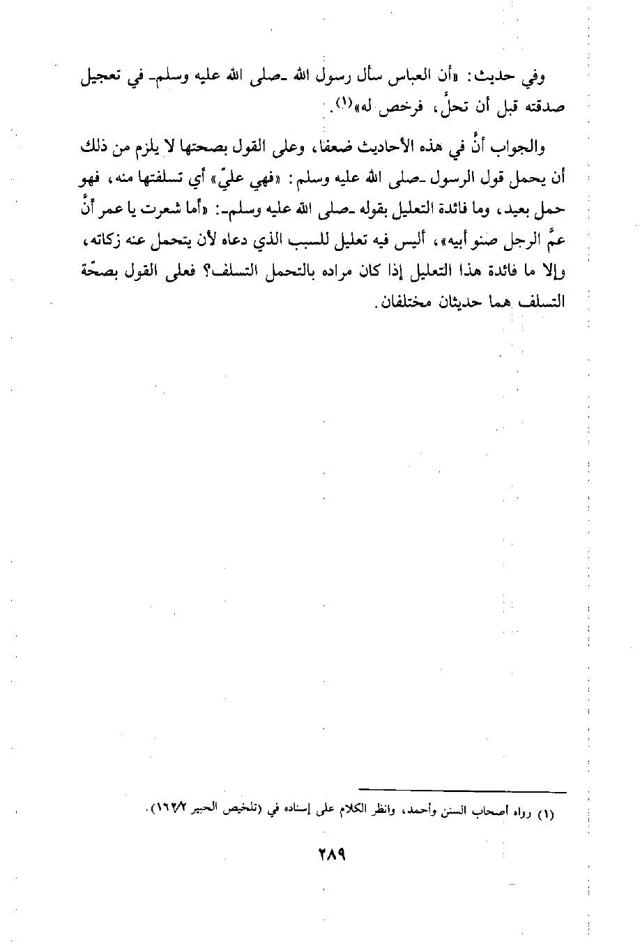 والجواب أنَّ في هذه الأحاديث ضعفا، وعلى القول بصحتها لا يلزم من ذلك أن يحمل قول الرسول -صلى الله عليه وسلم: "فهي عليّ" أي تسلفتها منه، فهو حمل بعيد، وما فائدة التعليل بقوله -صلى الله عليه وسلم-: "أما شعرت يا عمر أن عمَّ الرجل صنو أبيه"، أليس فيه تعليل للسبب الذي دعاه لأن يتحمل عنه زكاته، وإلا ما فائدة هذا التعليل إذا كان مراده بالتحمل التسلف؟ فعلى القول بصحّة التسلف هما حديثان مختلفان.