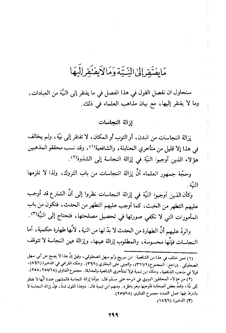 (¬1) ممن خالف في هذا من الشافعية: ابن سريج وأبو سهل الصعلوكي، وقيل إن هذا لا يصح عن أبي سهل الصعلوكي. (راجع: المجموع (1/ 361)، والعيني على البخاري (1/ 32). وحكاه القرافي في الذخيرة (1/ 82)، قولا في مذهب الشافعية، وحكاه ابن تيمية قولا لمتأخري الشافعية والحنابلة. مجموع الفتاوى (18/ 257، 258).