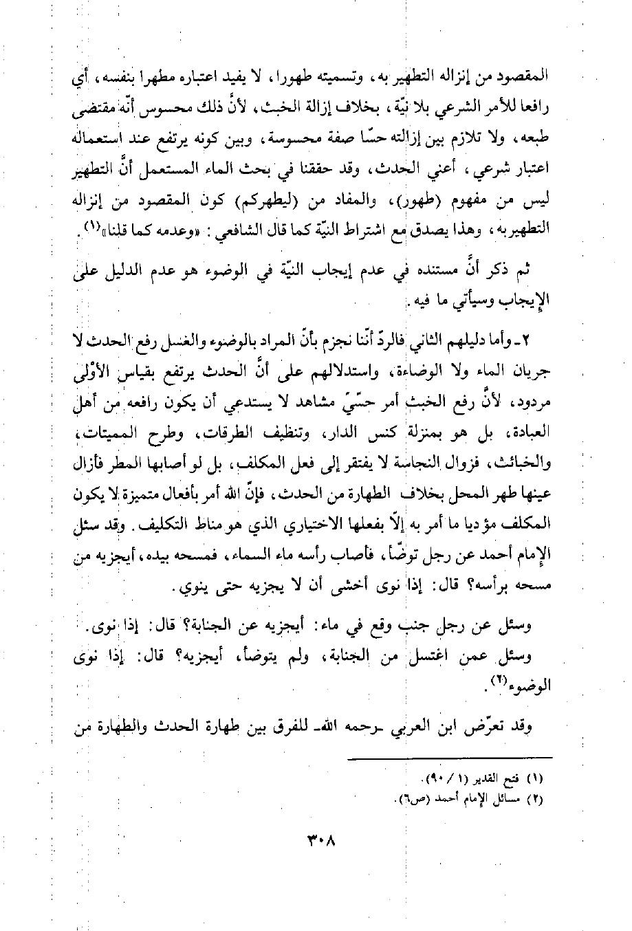 2 - وأما دليلهم الثاني فالرد أننا نجزم بأنّ المراد بالوضوء والغسل رفع الحدث لا جريان الماء ولا الوضاءة، واستدلالهم على أنَّ الحدث يرتفع بقياس الأوْلى مردود، لأن رفع الخبث أمر حسيّ مشاهد لا يستدعي أن يكون رافعه من أهل العبادة، بل هو بمنزلة كنس الدار، وتنظيف الطرقات، وطرح المميتات، والخبائث، فزوال النجاسة لا يفتقر إلى فعل المكلف، بل لو أصابها المطر فأزال عينها طهر المحل بخلاف الطهارة من الحدث، فإن الله أمر بأفعال متميزة لا يكون المكلف مؤديا ما أمر به إلاّ بفعلها الاختياري الذي هو مناط التكليف. وقد سئل الإمام أحمد عن رجل توضّأ، فأصاب رأسه ماء السماء، فمسحه بيده، أيجزيه من مسحه برأسه؟ قال: إذا نوى أخشى أن لا يجزيه حتى ينوي.