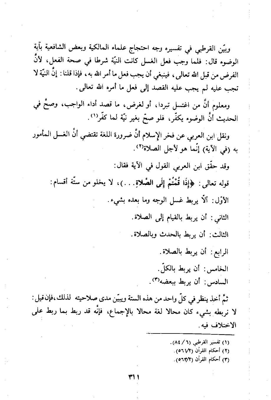 وبيّن القرطبي في تفسيره وجه احتجاج علماء المالكية وبعض الشافعية بآية الوضوء قال: فلما وجب فعل الغسل كانت النية شرطا في صحة الفعل، لأن الفرض من قبل الله تعالى، فينبغي أن يجب فعل ما أمر الله به، فإذا قلنا: إن النيّة لا تجب عليه لم يجب عليه القصد إلى فعل ما أمره الله تعالى.