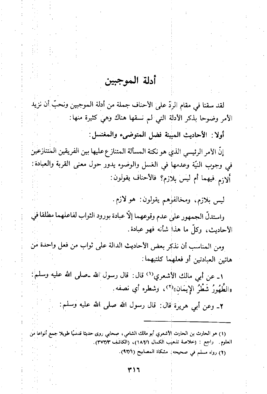 1 - عن أبي مالك الأشعري (¬1) قال: قال رسول الله -صلى الله عليه وسلم-: "الطَّهُور شَطْرُ الإيمَانِ" (¬2)، وشطره أي نصفه.