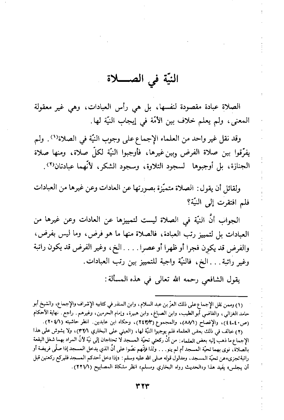 وقد نقل غير واحد من العلماء الِإجماع على وجوب النية في الصلاة (¬1). ولم يفرّقوا بين صلاة الفرض وبين غيرها، فأوجبوا النيّة لكلّ صلاة، ومنها صلاة الجنازة، بل أوجبوها لسجود التلاوة، وسجود الشكر، لأنهما عبادتان (¬2).
