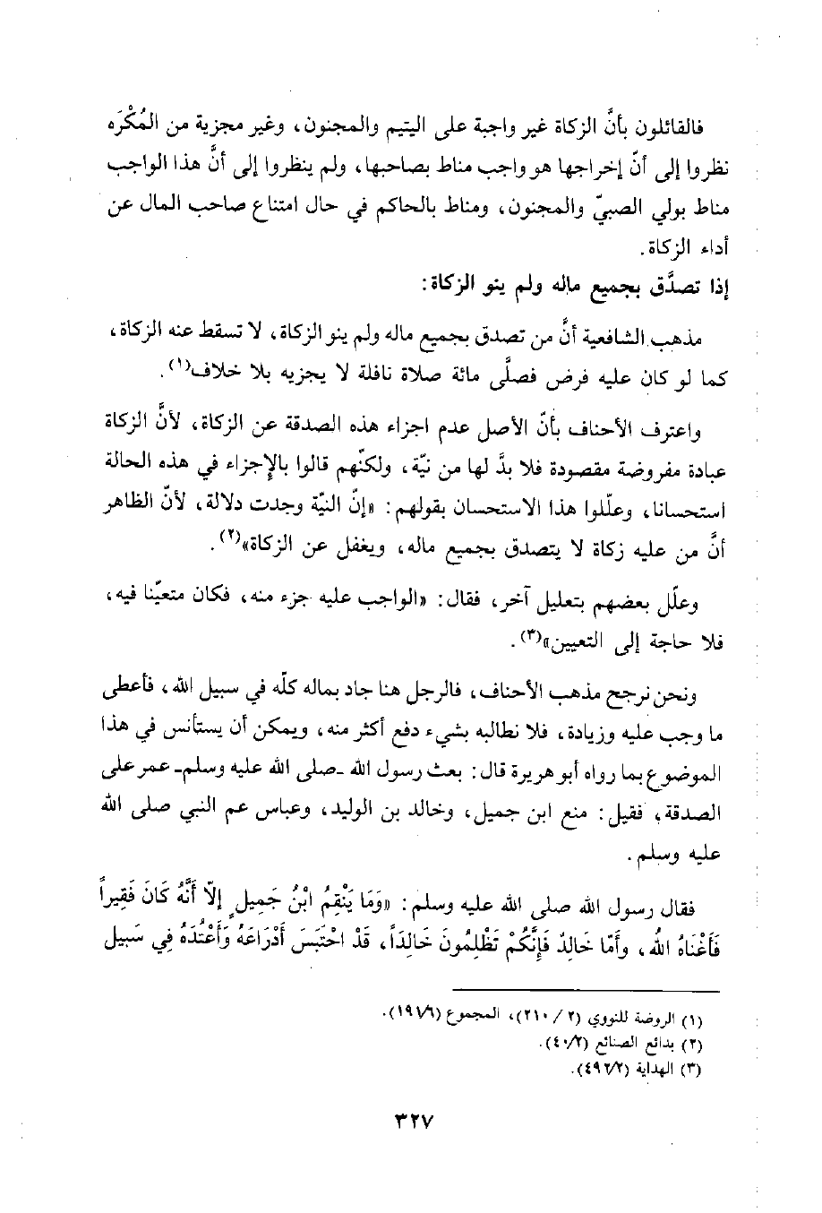 ونحن نرجح مذهب الأحناف، فالرجل هنا جاد بماله كله في سبيل الله، فأعطى ما وجب عليه وزيادة، فلا نطالبه لشيء دفع أكثر منه، ويمكن أن يستأنس في هذا الموضوع بما رواه أبو هريرة قال: بعث رسول الله -صلى الله عليه وسلم- عمر على الصدقة، فقيل: منع ابن جميل، وخالد بن الوليد، وعباس عم النبي صلى الله عليه وسلم.