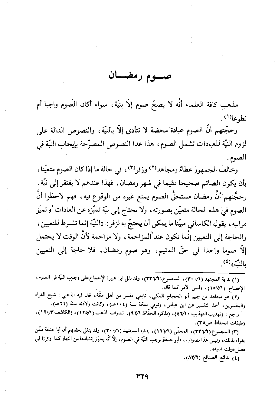 وخالف الجمهورَ عطاء ومجاهد (¬2) وزفر (¬3)، في حالة ما إذا كان الصوم متعينا، بأن يكون الصائم صحيحا مقيما في شهر رمضان، فهذا عندهم لا يفتقر إلى نيّة.