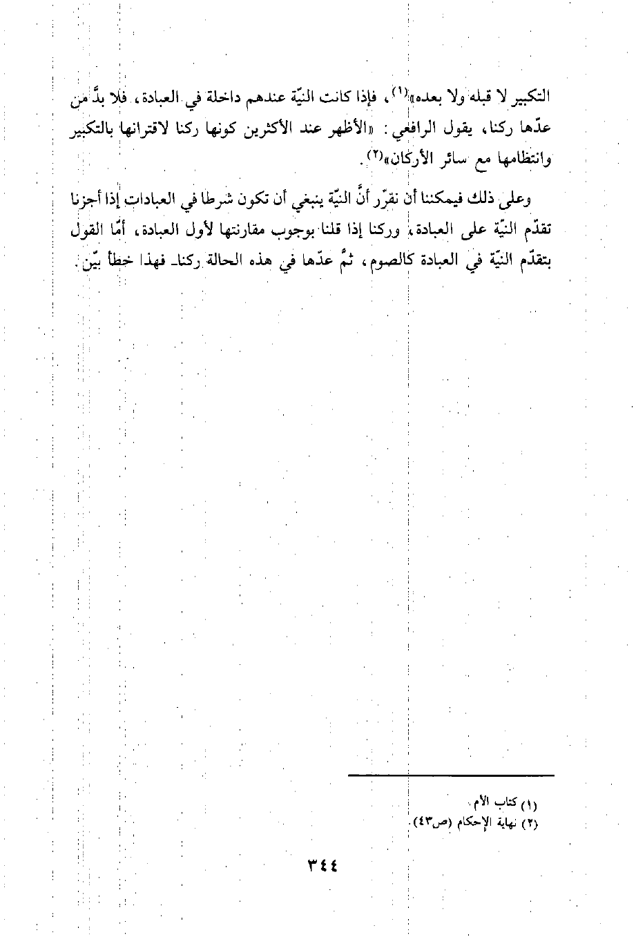 وعلى ذلك فيمكننا أن نقرّر أنَّ النيّة ينبغي أن تكون شرطا في العبادات إذا أجزنا تقدم النيّة على العبادة، وركنا إذا قلنا بوجوب مقارنتها لأول العبادة، أمّا القول بتقدّم النيّة في العبادة كالصوم، ثم عدّها في هذه الحالة ركنا- فهذا خطأ بيّن.