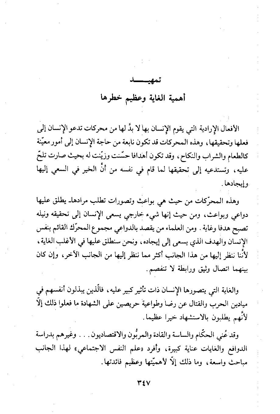 وقد عُني الحكّام والساسة والقادة والمربُّون والاقتصاديون ... وغيرهم بدراسة الدوافع والغايات عناية كبيرة، وأفرد "علم النفس الاجتماعي" لهذا الجانب مباحث واسعة، وما ذلك إلاّ لأهميّتها وعظيم فائدتها.