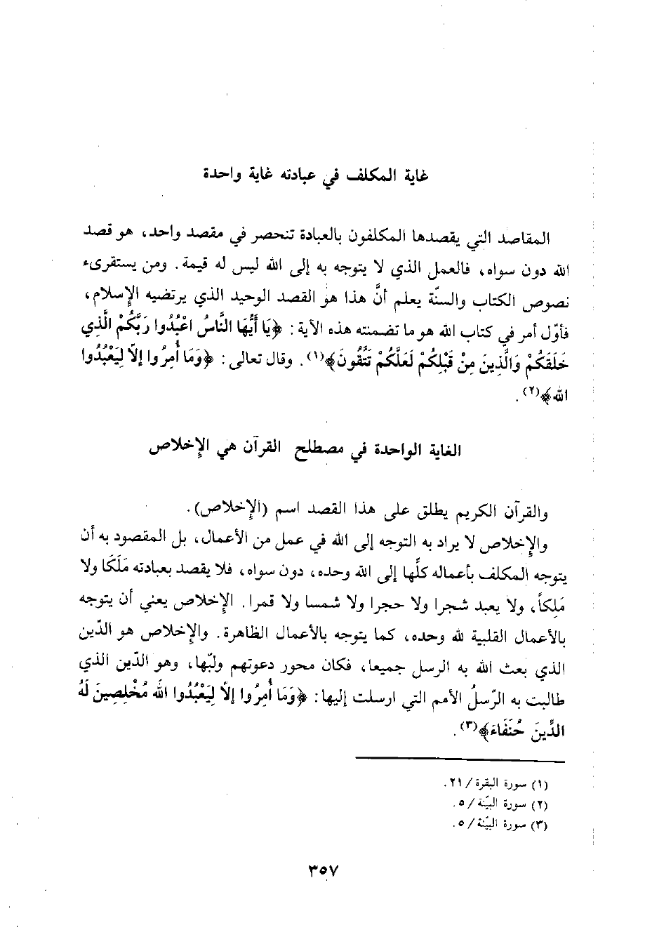 المقاصد التي يقصدها المكلفون بالعبادة تنحصر في مقصد واحد، هو قصد الله دون سواه، فالعمل الذي لا يتوجه به إلى الله ليس له قيمة. ومن يستقرىء نصوص الكتاب والسنّة يعلم أن هذا هو القصد الوحيد الذي يرتضيه الإِسلام، فأوّل أمر في كتاب الله هو ما تضمنته هذه الآية: {يَا أَيُّهَا النَّاسُ اعْبُدُوا رَبَّكُمُ الَّذِي خَلَقَكُمْ وَالَّذِينَ مِنْ قَبْلِكُمْ لَعَلَّكُمْ تَتَّقُونَ} (¬1). وقال تعالى: {وَمَا أُمِرُوا إِلَّا لِيَعْبُدُوا اللَّهَ} (¬2).