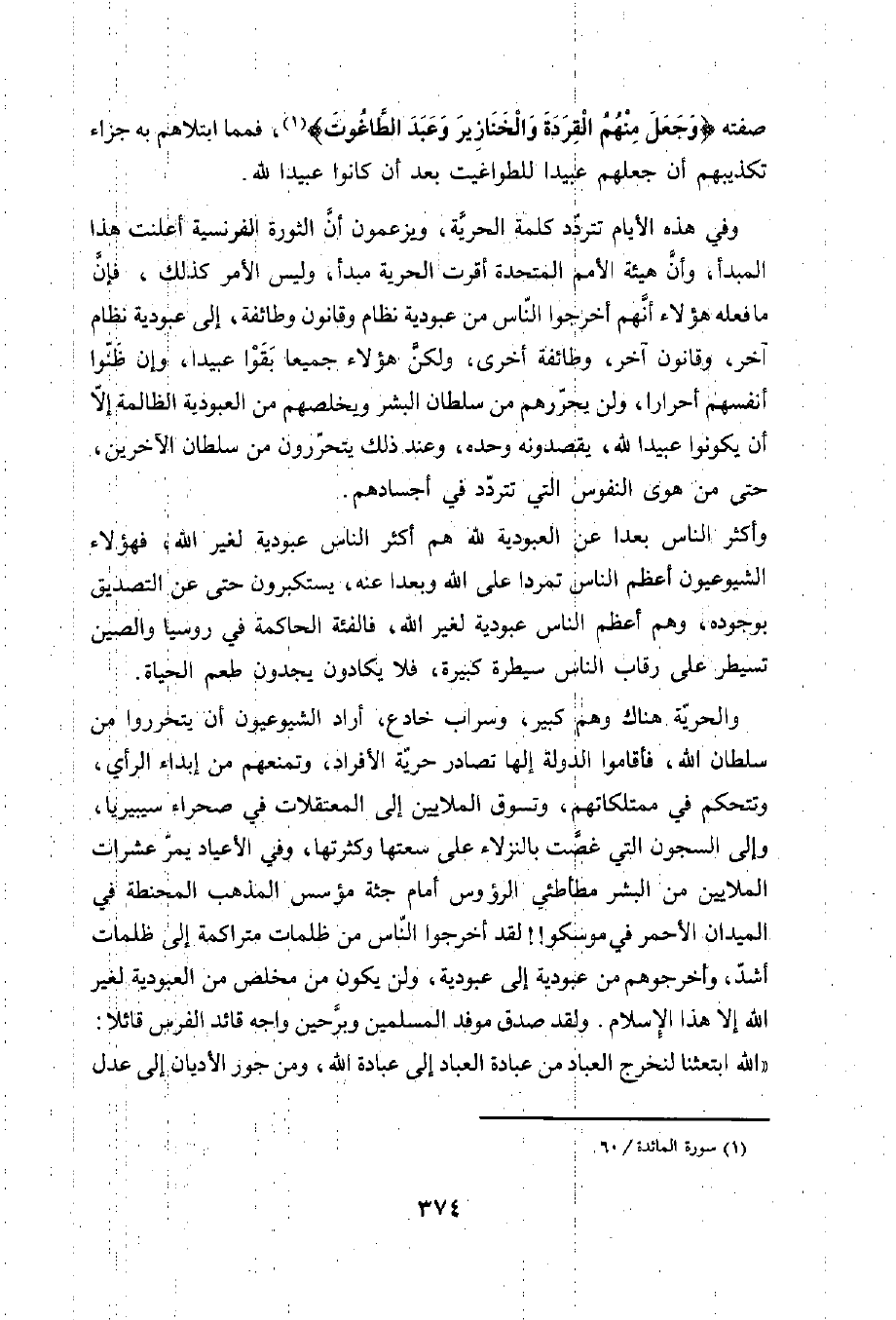 وفي هذه الأيام تتردّد كلمة الحرية، ويزعمون أنَّ الثورة الفرنسية أعلنت هذا المبدأ، وأن هيئة الأمم المتحدة أقرت الحرية مبدأ، وليس الأمر كذلك، فإنَّ ما فعله هؤلاء أنَّهم أخرجوا الناس من عبودية نظام وقانون وطائفة، إلى عبودية نظام آخر، وقانون آخر، وطائفة أخرى، ولكن هؤلاء جميعا بَقَوْا عبيدا، وإن ظَنّوا أنفسهم أحرارا، ولن يحررهم من سلطان البشر ويخلصهم من العبودية الظالمة إلاّ أن يكونوا عبيدا لله، يقصدونه وحده، وعند ذلك يتحررون من سلطان الآخرين، حتى من هوى النفوس التي تتردّد في أجسادهم.
