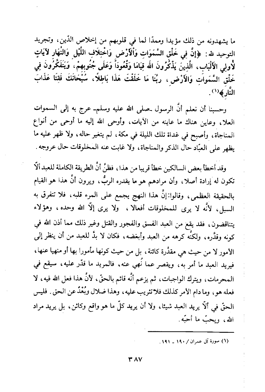 وقد أخطأ بعض السالكين خطأ قريبا من هذا، فظن أنَّ الطريقة الكاملة للعبد ألّا تكون له إرادة أصلا، وأن مرادهم هو ما يقدره الرب، ويرون أن هذا هو القيام بالحقيقة العظمى، وقالوا: إن هذا النهج يجمع على المرء قلبه، فلا تتفرق به السبل، لأنَّه لا يرى للمخلوقات أفعالا، ولا يرى إلاّ الله وحده، وهؤلاء يتناقضون، فقد يقع من العبد الفسق والفجور والقتل وغير ذلك مما أذن الله في كونه وقدره، ولكنَّه كرهه من العبد وأبغضه، فكان لا بد للعبد من أن ينظر إلى الأمور لا من حيث هي مقدّرة كائنة، بل من حيث كونها مأمورا بها أو منهيا عنها، فيريد العبد ما أمر به، ويقصر عما نُهي عنه، فالمريد ما قدر عليه، سيقع في المحرمات، ويترك الواجبات، ثم يزعم أنه قائم بالحق، لأن هذا فعل الله فيه، لا فعله هو، وما دام الأمر كذلك فلا تثريب عليه، وهذا ضلال وبُعْد عن الحق. فليس الحقّ في ألا يريد العبد شيئًا، ولا أن يريد كلّ ما هو واقع وكائن، بل يريد مراد الله، ويحبّ ما أحبه.