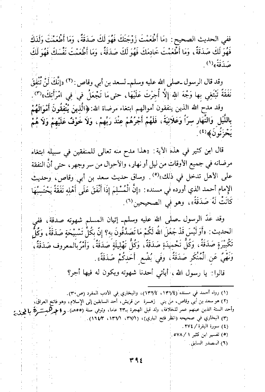 قال ابن كثير في هذه الآية: "هذا مدح منه تعالى للمنفقين في سبيله ابتغاء مرضاته في جميع الأوقات من ليل أو نهار، والأحوال من سر وجهر، حتى أنَّ النفقة على الأهل تدخل في ذلك" (¬5). وساق حديث سعد بن أبي وقاص، وحديث الِإمام أحمد الذي أورده في مسنده: "إِنَّ الْمُسلِمَ إِذَا أَنْفَقَ عَلَى أَهْلِهِ نَفَقَةً يَحْتَسبُهَا كَانَتْ لَهُ صَدَقَةً"، وهو في الصحيحين (¬6).