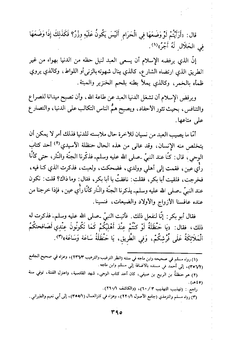 فقال أبو بكر: إنا لنفعل ذلك. فأتيت النبيّ -صلى الله عليه وسلم- فذكرت له ذلك، فقال: "يَا حَنْظَلَةُ لَوْ كنتم عندَ أَهْليكُمْ كَمَا تَكونونَ عِنْدِي لَصَافحتكمُ الْمَلَائِكَةُ عَلَى فُرشِكُمْ، وَفِي الطَّرِيقِ، يَا حَنْظَلَة سَاعَة وَسَاعَة" (¬3).