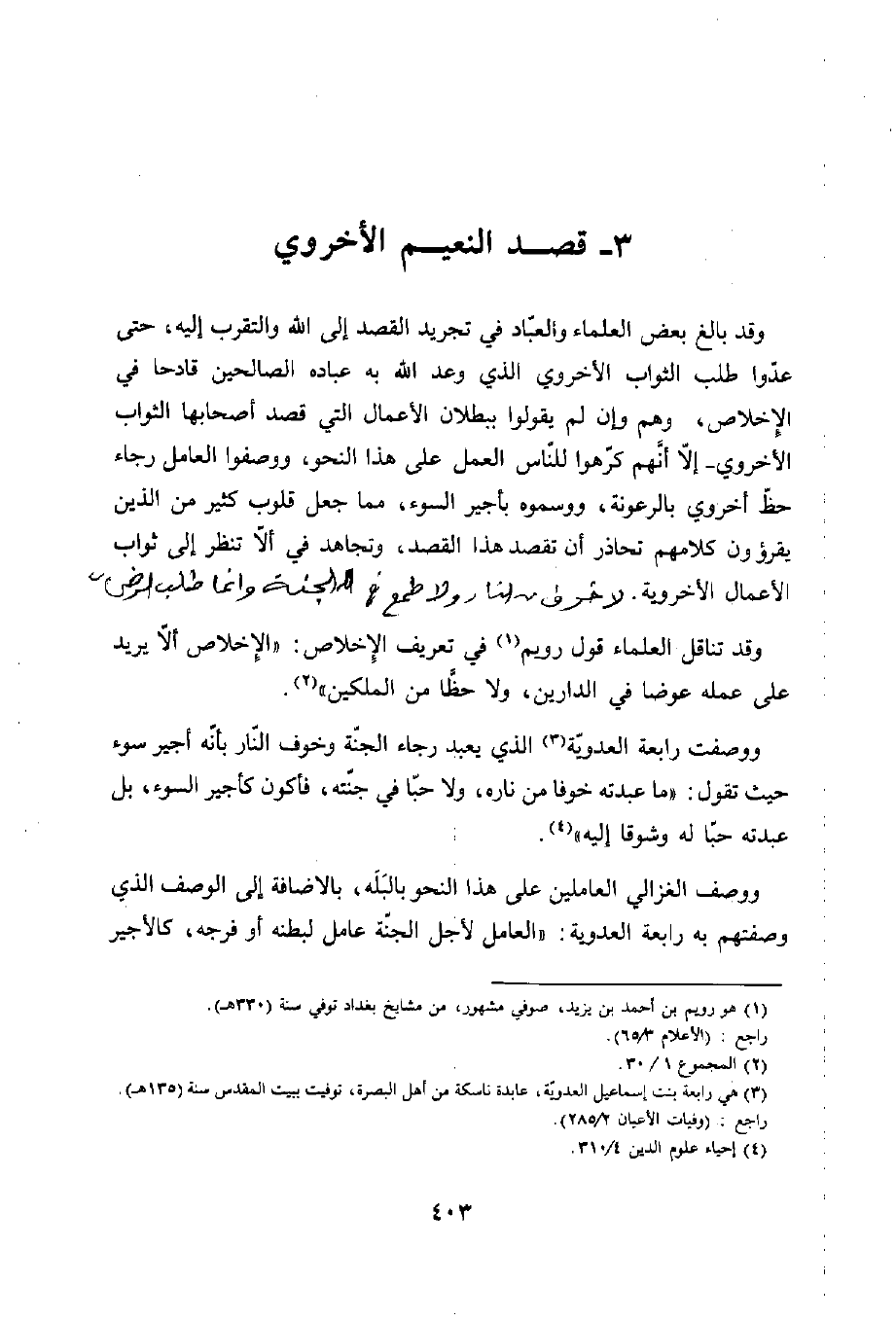 وقد بالغ بعض العلماء والعباد في تجريد القصد إلى الله والتقرب إليه، حتى عدّوا طلب الثواب الأخروي الذي وعد الله به عباده الصالحين قادحا في الإخلاص، وهم وإن لم يقولوا ببطلان الأعمال التي قصد أصحابها الثواب الأخروي- إلاّ أنهم كرهوا للناس العمل على هذا النحو، ووصفوا العامل رجاء حظّ أخروي بالرعونة، ووسموه بأجير السوء، مما جعل قلوب كثير من الذين يقرؤون كلامهم تحاذر أن تقصد هذا القصد، وتجاهد في ألا تنظر إلى ثواب الأعمال الأخروية.