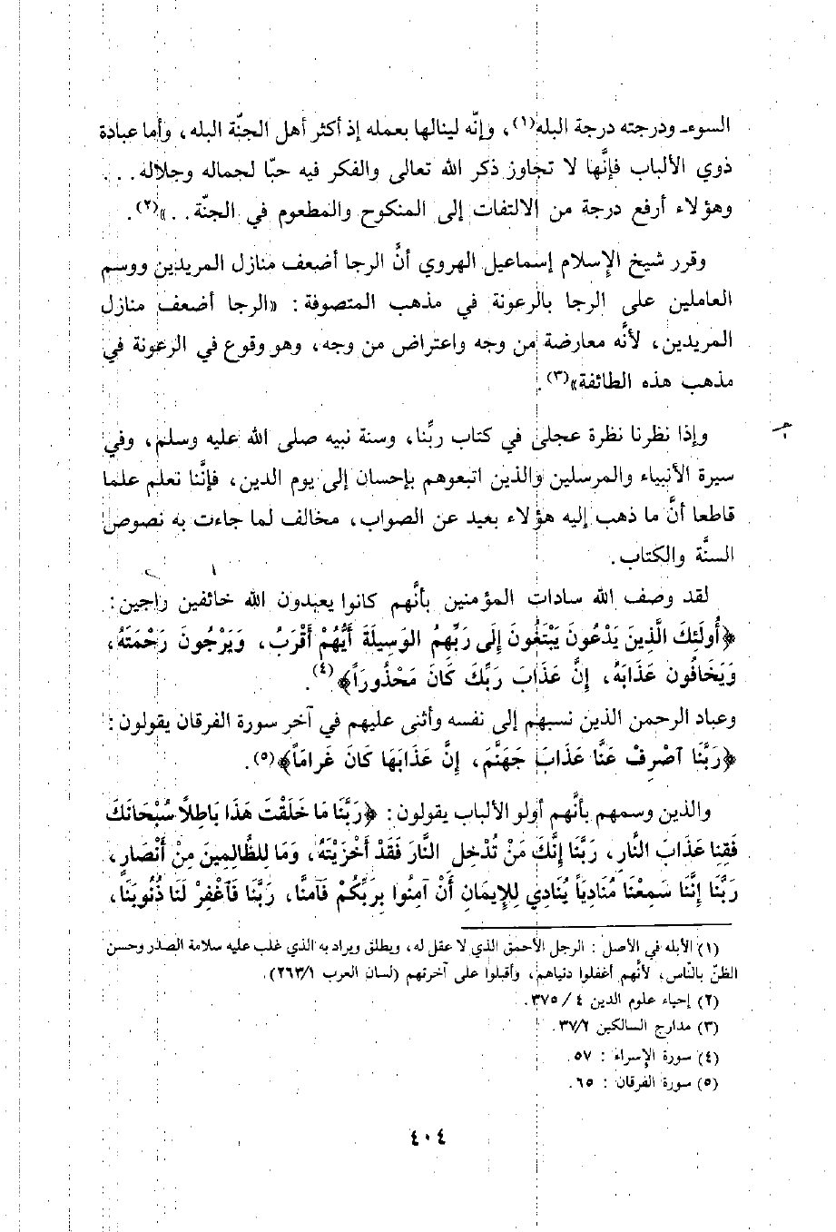 السوء - ودرجته درجة البله (¬1)، وإنّه لينالها بعمله إذ أكثر أهل الجنة البله، وأما عبادة ذوي الألباب فإنَّها لا تجاوز ذكر الله تعالى والفكر فيه حبا لجماله وجلاله ... وهؤلاء أرفع درجة من الالتفات إلى المنكوح والمطعوم في الجنة .. " (¬2).