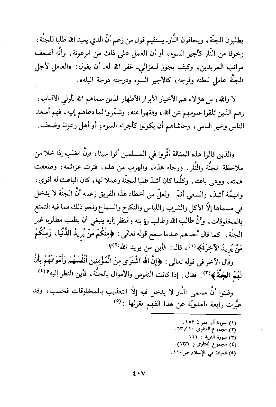 يطلبون الجنة، ويخافون النار- يستقيم قول من زعم أنّ الذي يعبد الله طلبا للجنة، وخوفا من النار كأجير السوء، أو أن العمل على ذلك من الرعونة، وأنه أضعف مراتب المريدين، وكيف يجوز للغزالي -غفر الله له- أن يقول: "العامل لأجل الجنة عامل لبطنه وفرجه، كالأجير السوء ودرجته درجة البله".