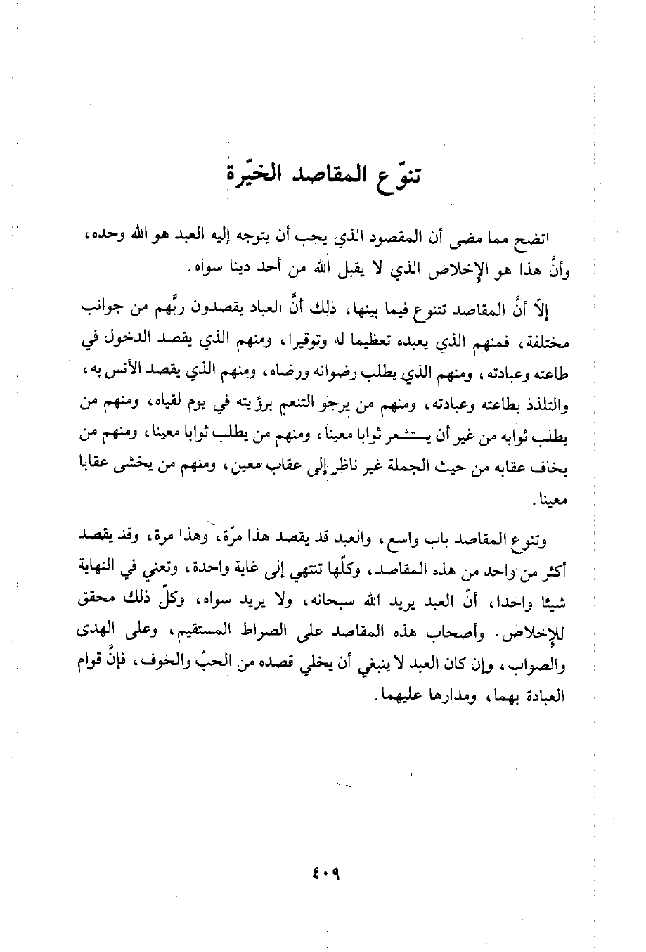 وتنوع المقاصد باب واسع، والعبد قد يقصد هذا مرة، وهذا مرة، وقد يقصد أكثر من واحد من هذه المقاصد، وكلّها تنتهي إلى غاية واحدة، وتعني في النهاية شيئًا واحدا، أنّ العبد يريد الله سبحانه، ولا يريد سواه، وكل ذلك محقق للإخلاص. وأصحاب هذه المقاصد على الصراط المستقيم، وعلى الهدى والصواب، وإن كان العبد لا ينبغي أن يخلي قصده من الحبّ والخوف، فإن قوام العبادة بهما، ومدارها عليهما.