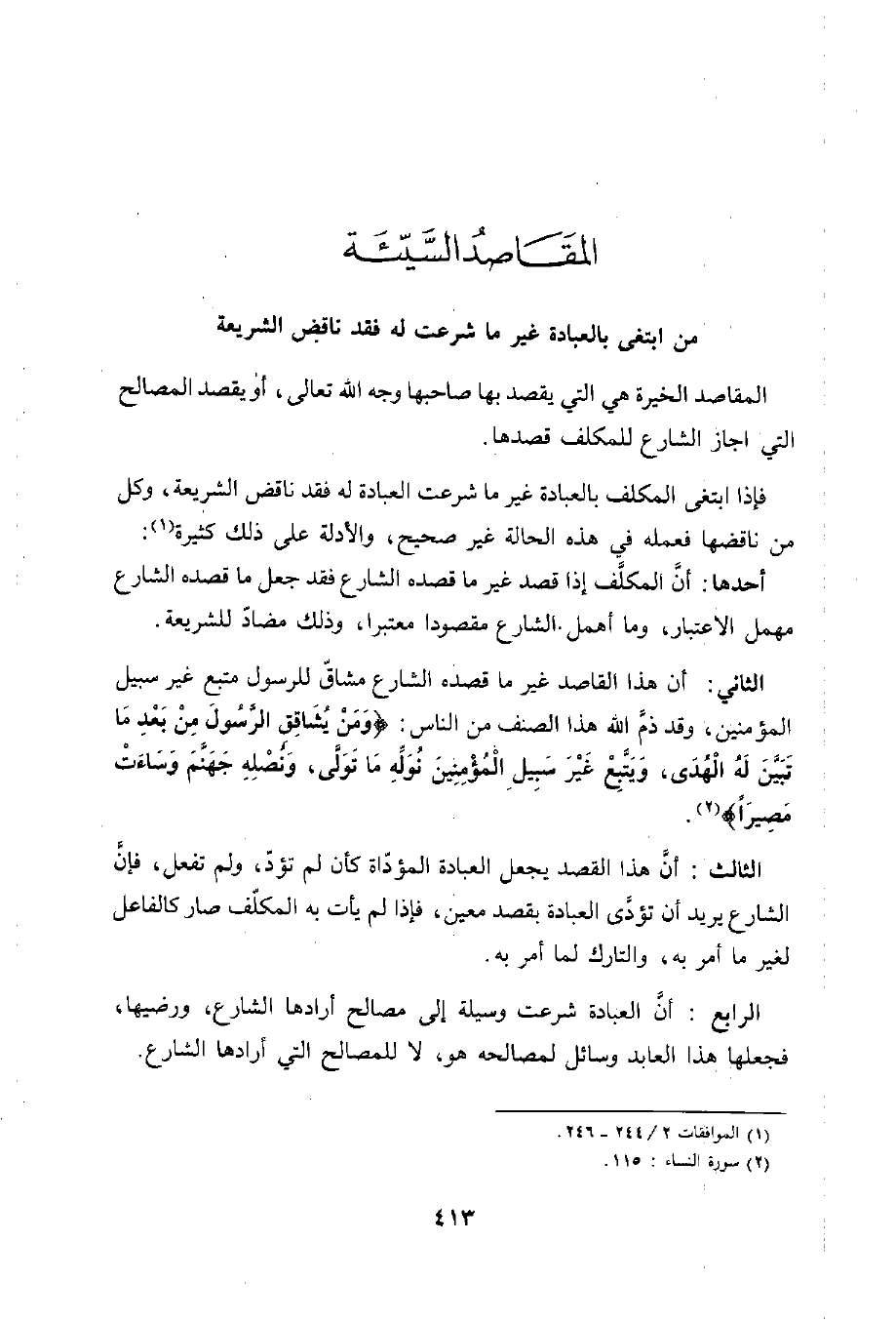 الثاني: أن هذا المقاصد غير ما قصده الشارع مشاقّ للرسول متبع غير سبيل المؤمنين، وقد ذمَّ الله هذا الصنف من الناسٍ: {وَمَنْ يُشَاقِقِ الرَّسُولَ مِنْ بَعْدِ مَا تَبَيَّنَ لَهُ الْهُدَى وَيَتَّبِعْ غَيْرَ سَبِيلِ الْمُؤْمِنِينَ نُوَلِّهِ مَا تَوَلَّى وَنُصْلِهِ جَهَنَّمَ وَسَاءَتْ مَصِيرًا} (¬2).