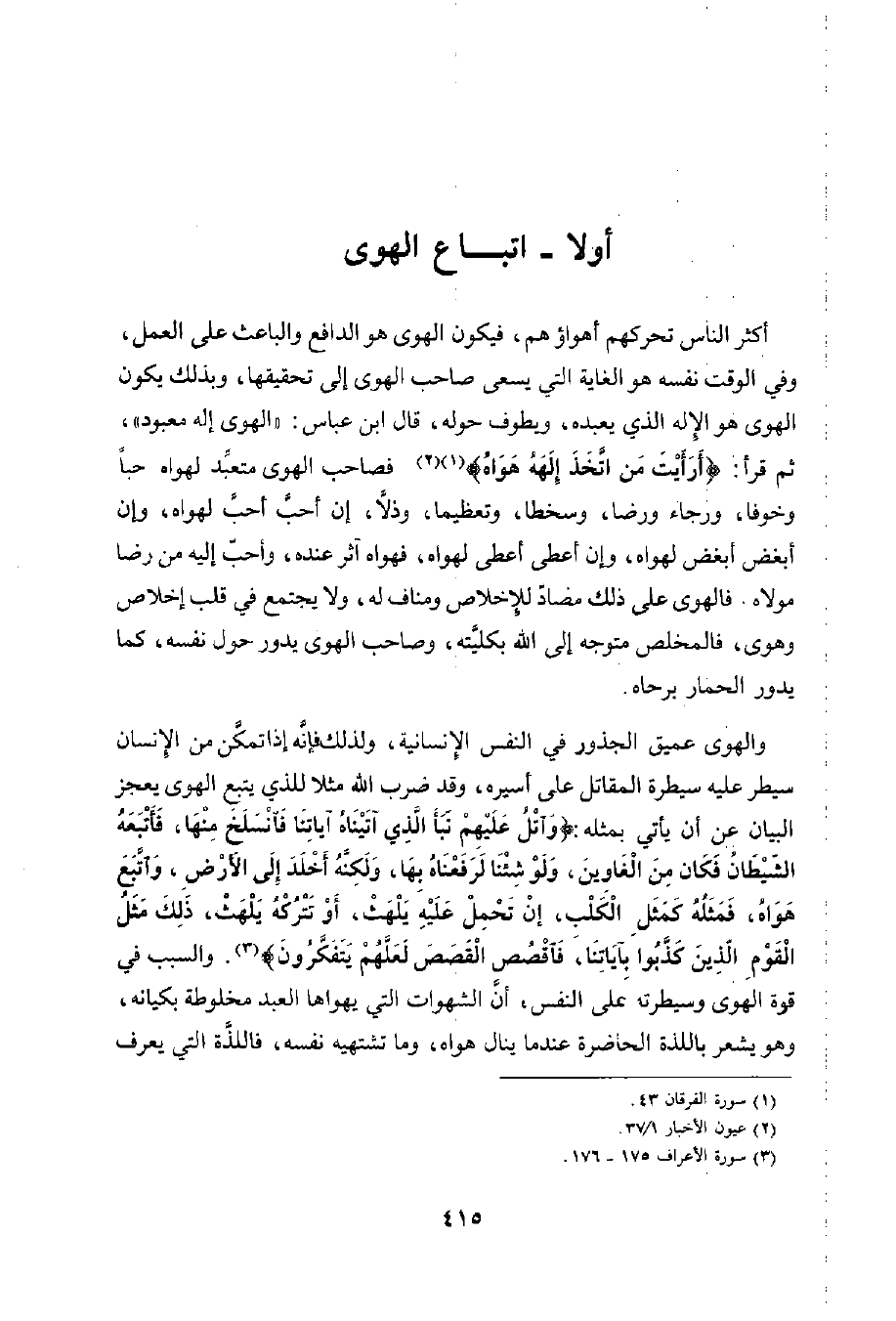 والهوى عميق الجذور في النفس الإنسانية، ولذلك فإنه إذا تمكن من الإنسان سيطر عليه سيطرة المقاتل على أسيره، وقد ضرب الله مثلا للذي يتبع الهوى يعجز البيان عن أن يأتي بمثله: {وَاتْلُ عَلَيْهِمْ نَبَأَ الَّذِي آتَيْنَاهُ آيَاتِنَا فَانْسَلَخَ مِنْهَا فَأَتْبَعَهُ الشَّيْطَانُ فَكَانَ مِنَ الْغَاوِينَ (175) وَلَوْ شِئْنَا لَرَفَعْنَاهُ بِهَا وَلَكِنَّهُ أَخْلَدَ إِلَى الْأَرْضِ وَاتَّبَعَ هَوَاهُ فَمَثَلُهُ كَمَثَلِ الْكَلْبِ إِنْ تَحْمِلْ عَلَيْهِ يَلْهَثْ أَوْ تَتْرُكْهُ يَلْهَثْ ذَلِكَ مَثَلُ الْقَوْمِ الَّذِينَ كَذَّبُوا بِآيَاتِنَا فَاقْصُصِ الْقَصَصَ لَعَلَّهُمْ يَتَفَكَّرُونَ} (¬3). والسبب في قوة الهوى وسيطرته على النفس، أن الشهوات التي يهواها العبد مخلوطة بكيانه، وهو يشعر باللذة الحاضرة عندما ينال هواه، وما تشتهيه نفسه، فاللذَّة التي يعرف