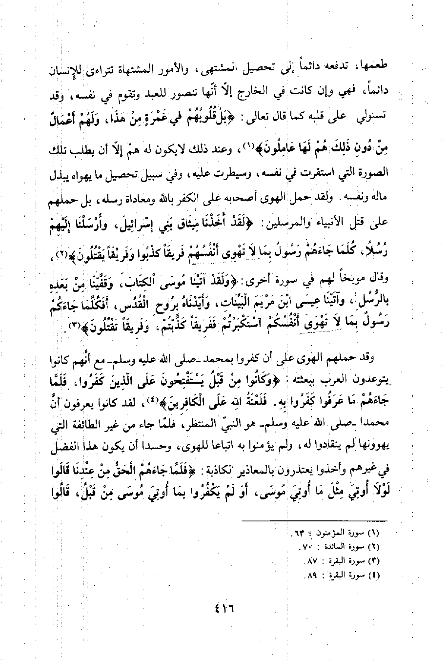 طعمها، تدفعه دائمًا إلى تحصيل المشتهى، والأمور المشتهاة تتراءى للإنسان دائمًا، فهي وإن كانت في الخارج إلاّ أنها تتصور للعبد وتقوم في نفسه، وقد تستولي على قلبه كما قال تعالى: {بَلْ قُلُوبُهُمْ فِي غَمْرَةٍ مِنْ هَذَا وَلَهُمْ أَعْمَالٌ مِنْ دُونِ ذَلِكَ هُمْ لَهَا عَامِلُونَ} (¬1)، وعند ذلك لا يكون له همّ إلاّ أن يطلب تلك الصورة التي استقرت في نفسه، وسيطرت عليه، وفي سبيل تحصيل ما يهواه ببذل ماله ونفسه. ولقد حمل الهوى أصحابه على الكفر بالله ومعاداة رسله، بل حملهم على قتل الأنبياء والمرسلين: {لَقَدْ أَخَذْنَا مِيثَاقَ بَنِي إِسْرَائِيلَ وَأَرْسَلْنَا إِلَيْهِمْ رُسُلًا كُلَّمَا جَاءَهُمْ رَسُولٌ بِمَا لَا تَهْوَى أَنْفُسُهُمْ فَرِيقًا كَذَّبُوا وَفَرِيقًا يَقْتُلُونَ} (¬2)، وقال موبخًا لهم في سورة أخرى: {وَلَقَدْ آتَيْنَا مُوسَى الْكِتَابَ وَقَفَّيْنَا مِنْ بَعْدِهِ بِالرُّسُلِ وَآتَيْنَا عِيسَى ابْنَ مَرْيَمَ الْبَيِّنَاتِ وَأَيَّدْنَاهُ بِرُوحِ الْقُدُسِ أَفَكُلَّمَا جَاءَكُمْ رَسُولٌ بِمَا لَا تَهْوَى أَنْفُسُكُمُ اسْتَكْبَرْتُمْ فَفَرِيقًا كَذَّبْتُمْ وَفَرِيقًا تَقْتُلُونَ} (¬3).