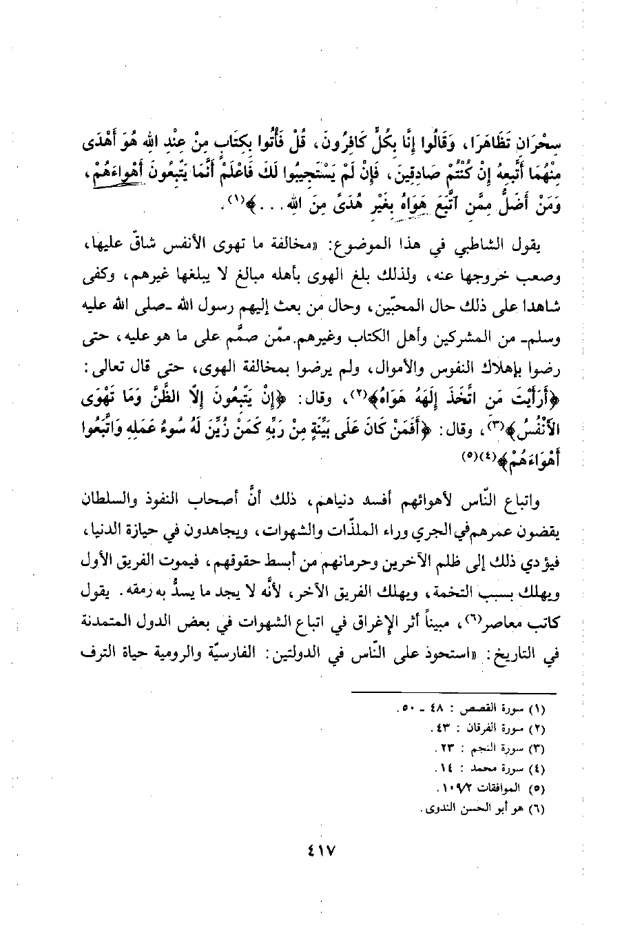 سِحْرَانِ تَظَاهَرَا وَقَالُوا إِنَّا بِكُلٍّ كَافِرُونَ (48) قُلْ فَأْتُوا بِكِتَابٍ مِنْ عِنْدِ اللَّهِ هُوَ أَهْدَى مِنْهُمَا أَتَّبِعْهُ إِنْ كُنْتُمْ صَادِقِينَ (49) فَإِنْ لَمْ يَسْتَجِيبُوا لَكَ فَاعْلَمْ أَنَّمَا يَتَّبِعُونَ أَهْوَاءَهُمْ وَمَنْ أَضَلُّ مِمَّنِ اتَّبَعَ هَوَاهُ بِغَيْرِ هُدًى مِنَ اللَّهِ} (¬1).