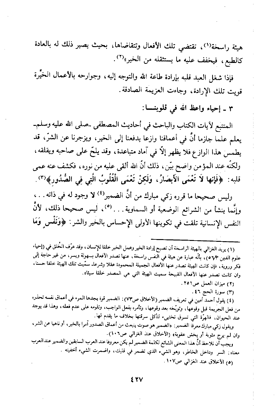 (¬1) يريد الغزالي التي بالهيئة الراسخة أن تصبح إرادة الخير وعمل الخير خلقا للإنسان، وقد عرف الخلق في (إحياء علوم الدين 3/ 56)، بأنه عبارة عن هيئة في النفس راسخة، عنها تصدر الأفعال بسهولة ويسر، من غير حاجة إلى فكر وروية، فإن كانت الهيئة تصدر عنها الأفعال الجميلة المحمودة عقلا وشرعا -سميت تلك الهيئة خلقا سيئا". وإن كانت تصدر عنها الأفعال القبيحة سميت الهيئة التي هي المصدر خلقا سيئا".