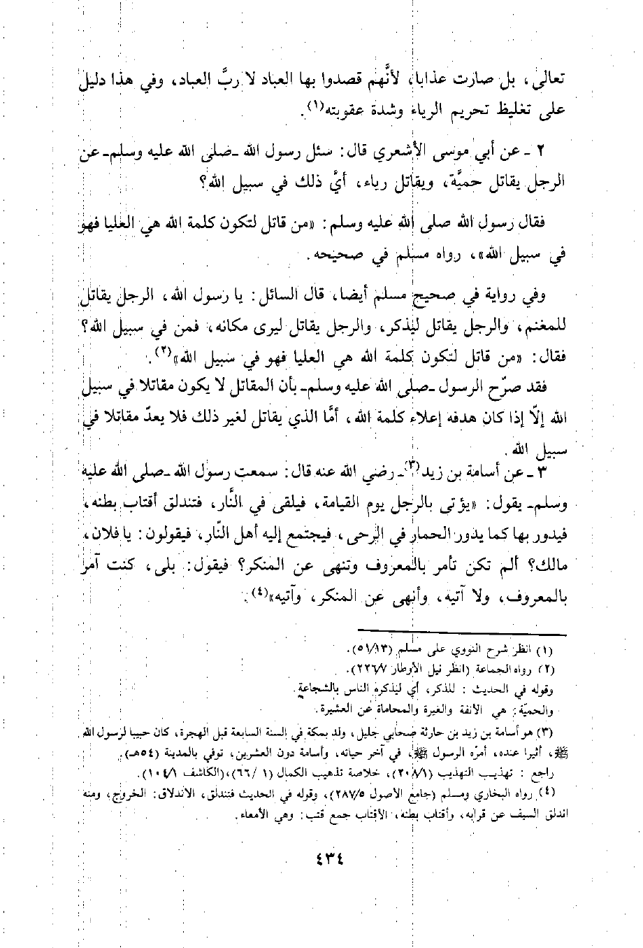 3 - عن أسامة بن زيد (¬3) -رضي الله عنه- قال: سمعت رسول الله -صلى الله عليه وسلم- يقول: "يؤتى بالرجل يوم القيامة، فيلقى في النار، فتندلق أقتاب بطنه، فيدور بها كما يدور الحمار في الرحى، فيجتمع إليه أهل النار، يقولون: يا فلان، مالك؟ ألم تكن تأمر بالمعروف وتنهى عن المنكر؟ فيقول: بلى، كنت آمر بالمعروف، ولا آتيه، وأنهى عن المنكر، وآتيه" (¬4).
