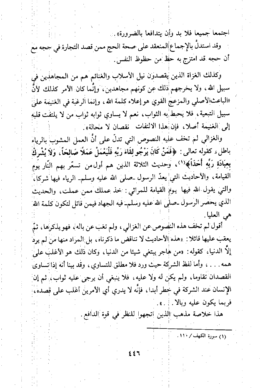 والغزالي لم تخف عليه النصوص التي تدلّ على أن العمل المشوب بالرياء باطل، كقوله تعالى: {فَمَنْ كَانَ يَرْجُو لِقَاءَ رَبِّهِ فَلْيَعْمَلْ عَمَلًا صَالِحًا وَلَا يُشْرِكْ بِعِبَادَةِ رَبِّهِ أَحَدًا} (¬1)، وحديث الثلاثة الذين هم أول من تسعر بهم النّار يوم القيامة، والأحاديث التي يعدّ الرسول -صلى الله عليه وسلم- الرياء فيها شركا، والتي يقول الله فيها يوم القيامة للمرائي: خذ عملك ممن عملت، والحديث الذي يحصر الرسول -صلى الله عليه وسلم- فيه الجهاد فمن قاتل لتكون كلمة الله هي العليا.